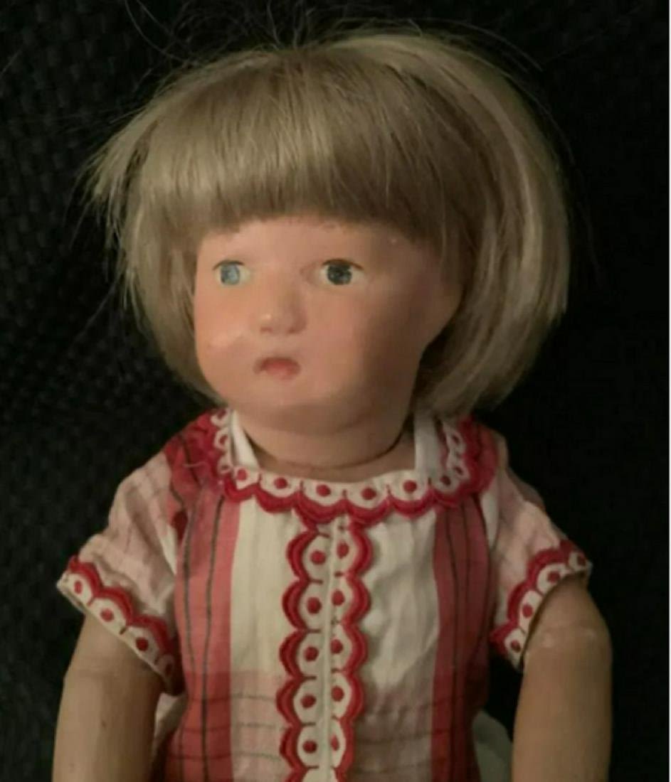 Schoenhut wooden toddler doll from 1919, 11 inches tall, an 11/107w on a walker body, with the Schoenhut label on her back (est. $1,000-$5,000).