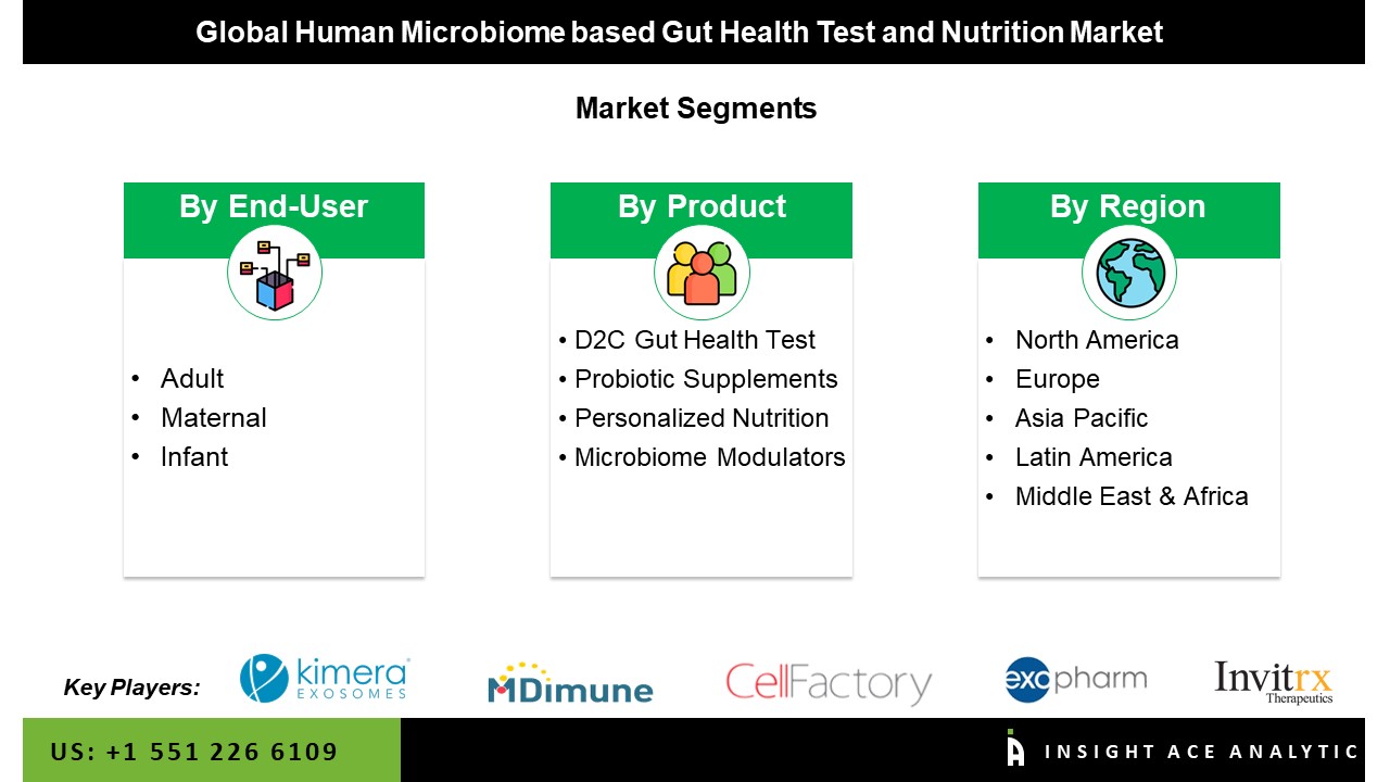 Major market players operating in the Human Microbiome-based Gut Health Test and Nutrition market include Exe, Kerry, Immune Biotech, Pendulum Therapeutics, Evolve Biosystems, Gerber, Lovebug probiotics, Mommy's Bliss, Zarbees, Mamasselect, Hyperbiotics, Everidis, Floraster, Enfamil, Culturelle, BioGaia, Seed Health, ResBiotic, Fitbiomics, HSK Genetech, Mybacs, ISOThrive, Nouri, Bayer Consumer Health, Clasado Biosciences, CometBio, Essential formulae, Viome, Atlas Biomed, Flore, Bioms, Ombre, Biohm, Affinity DNA, Freshly fermented, Carbiotix, Troo, Verisana, Throne, Phable, Biomesight, Invivo, Neovos, The BioArte, Holobiome, Bio & Me, Nexbiome, Holobiome, Finch Therapeutics, Byheart, Mybiotics, Vedanta Biosciences, Other Prominent Players.