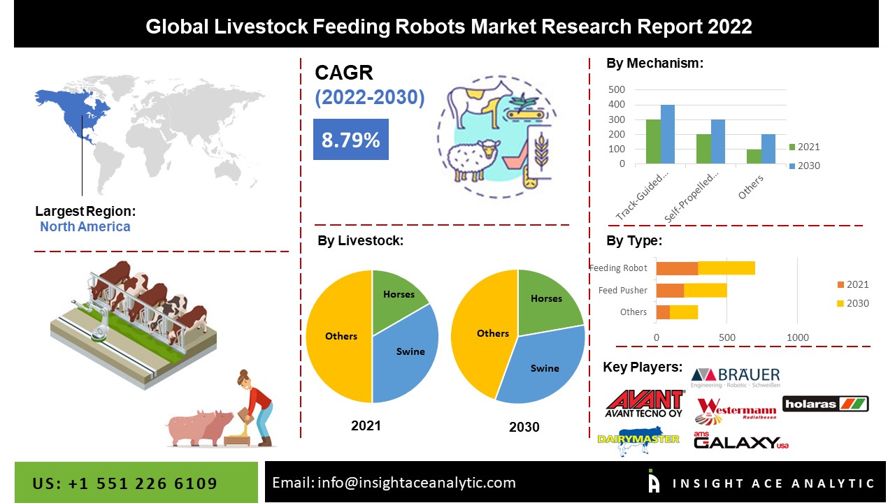 NEW JERSEY, NJ, USA, August 25, 2022 /EINPresswire.com/ -- InsightAce Analytic Pvt. Ltd. announces the release of a market assessment report on the "Global Livestock Feeding Robots Market- by Livestock (Ruminants, Horses, Swine, Poultry, and Others), Mechanism (Track-Guided Robots and Self-Propelled Robot), Type (Feed Pusher, Feeding Robots, and Robotic Feed Kitchen/Storage), Farm Size (Small and Medium-Sized Farms and Large Sized Farms), Trends, Industry Competition Analysis, Revenue and Forecast To 2030."