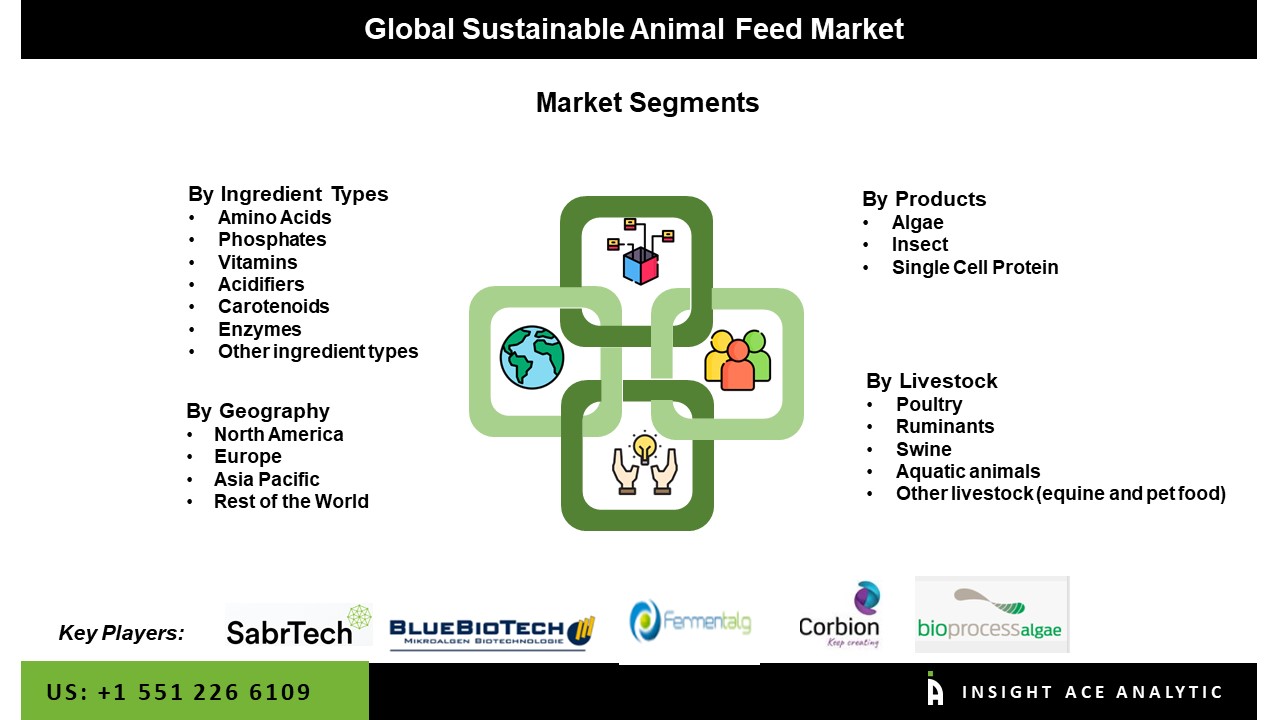 NEW JERSEY, NJ, USA, August 25, 2022 /EINPresswire.com/ -- InsightAce Analytic Pvt. Ltd. announces the release of a market assessment report on the "Global Sustainable Animal Feed Market- by Ingredient Types (Amino Acids, Phosphates, Vitamins, Acidifiers, Carotenoids, Enzymes, Mycotoxin Detoxifiers, Flavors & Sweeteners, Antibiotics, Minerals, Antioxidants, Non-protein Nitrogen, Phytogenics, Preservatives, and Probiotics), Products (Algae, Insect, and Single-Cell Protein), Livestock (Poultry, Ruminants, Swine, Aquatic Animals, and Other Livestock (Equine and Pet food)), Trends, Industry Competition Analysis, Revenue and Forecast To 2030."