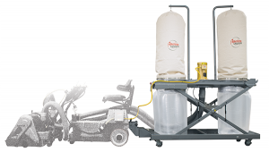 The Gym Vac is tethered to and powered by the existing power system driving the sanding machines and rider unit. A 3HP induction motor provides 2,500 CFM of air flow to twin high-volume dust collection bags. Dust is collected in standard, off-the-shelf contractor trash bags. The unit is designed with a pheumatic-assist collapsible frame that allows for one-person setup and easy transport on and off the job site.