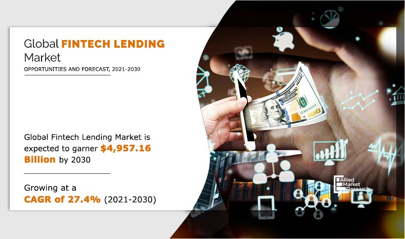 FinTech lending market size valued at $449.89 billion in 2020 and is projected to reach $4,957.16 billion by 2030, growing at a CAGR of 27.4% from 2021 to 2030