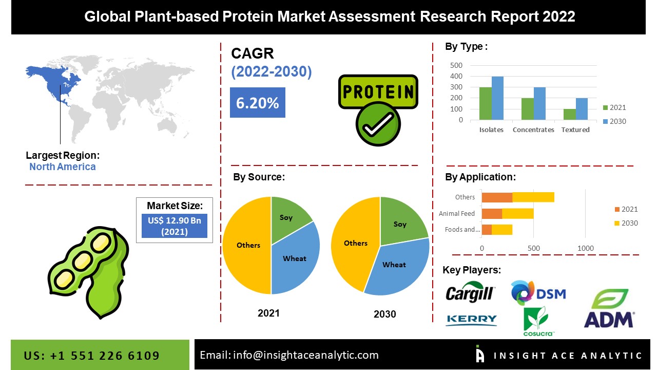NEW JERSEY, SATTE NJ, COUNTRY USA, August 26, 2022 /EINPresswire.com/ -- InsightAce Analytic Pvt. Ltd. announces the release of a market assessment report on the "Global Plant-based Protein Market- by Source (Soy, Wheat, Pea, and Others), Type (Isolates, Concentrates, and Textured), Form (Dry and Liquid), Deployment Mode (Foods and Beverage, Animal Feed, Nutrition and Health Supplements, and Pharmaceuticals), Trends, Industry Competition Analysis, Revenue and Forecast To 2030."