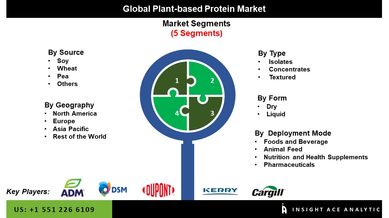 Major market players operating in the Plant-based Protein market include Kerry Group, Cargill Inc., Glanbia plc., Wilmar International, Emsland Group, Puris, Cosucra Group, AMCO Proteins Company, Batory Foods, Roquette Freres, Ingredion Inc., Burcon Nutracience, Sotexpro, AGT Food & Ingredients, Beneo, Prolupin Gmbh, Aminola, Herblink Biotech Corporation, Archer Daniels Midland Company, DSM, E.I. Dupont De Nemours and Company, ET Chem, Shandong Jianyuan Group, The Greenlans LLC, Parabel, Corbion NV, Danone, Farbest Brands, Axiom Foods Inc., NOW Foods, Tate & Lyle Plc, Crespel & Deiters GmbH & Co. KG, CHS Inc., and Other Prominent Players.