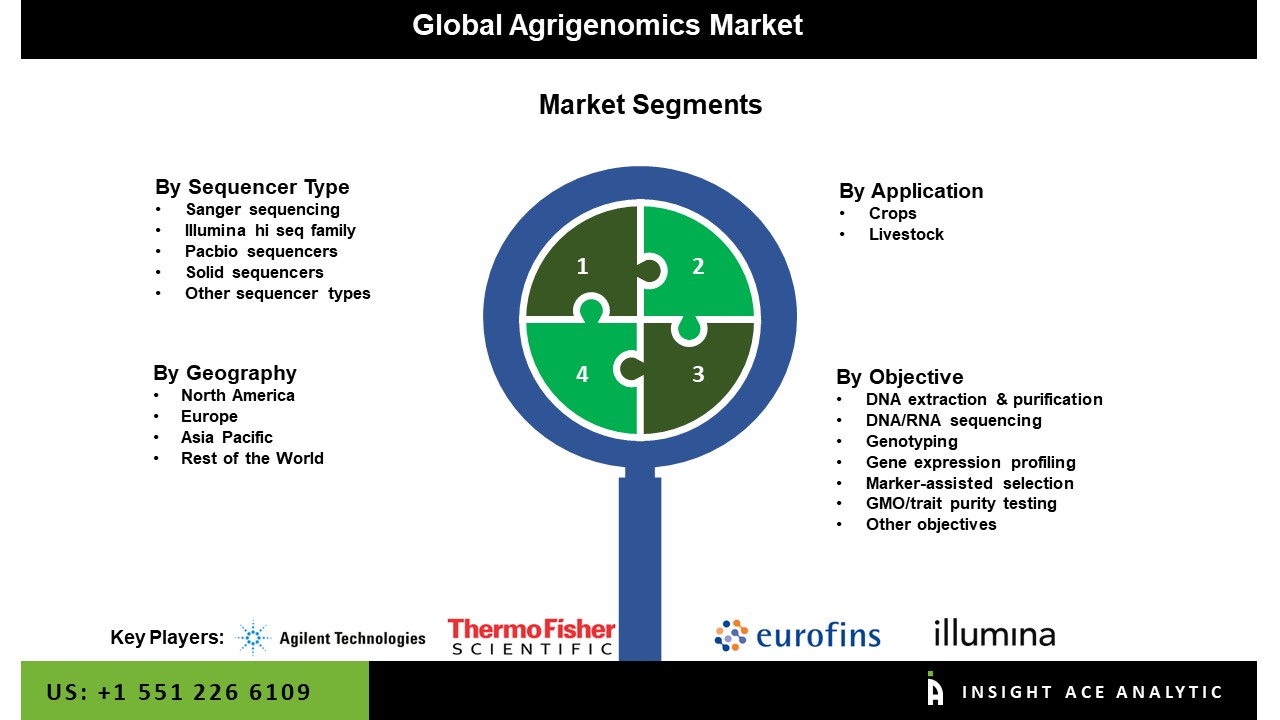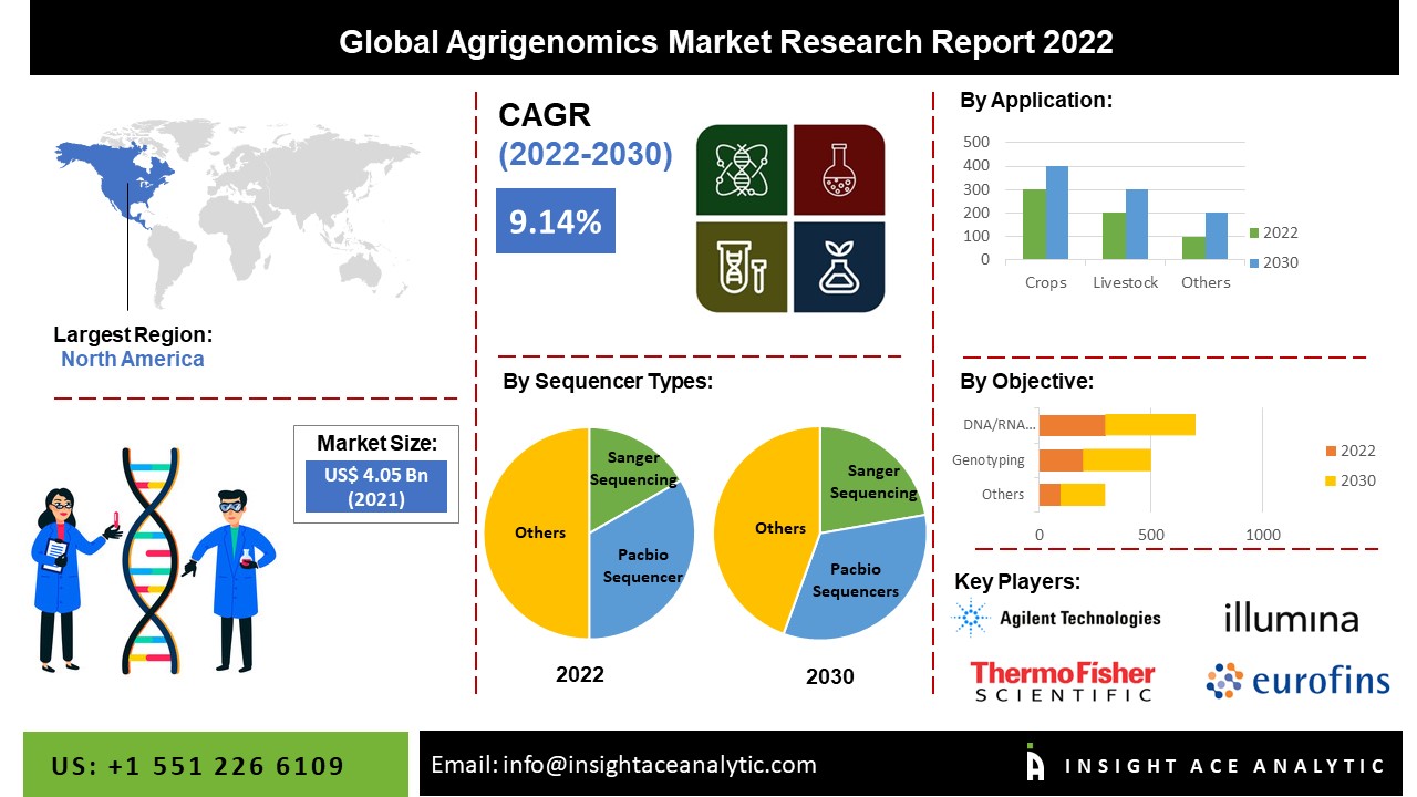 NEW JERSEY, SATTE NJ, COUNTRY USA, August 29, 2022 /EINPresswire.com/ -- InsightAce Analytic Pvt. Ltd. announces the release of a market assessment report on the "Global Agrigenomics Market- by Sequencer Types (Sanger Sequencing, Illumina hi Seq Family, Pacbio Sequencers, Solid Sequencers, and Other Sequencer Types), Objectives (DNA Extraction & Purification, DNA/RNA Sequencing, Genotyping, Gene Expression Profiling, Marker-assisted Selection, GMO/Trait Purity Testing, and Other Objectives), Application (Crops and Livestock), Trends, Industry Competition Analysis, Revenue and Forecast To 2030."