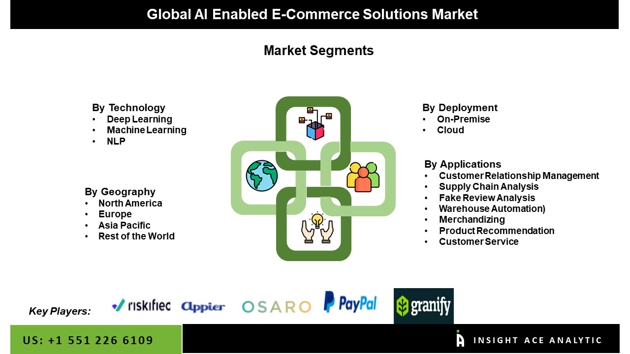 Major market players operating in the AI-Enabled E-Commerce Solutions market include Manthan Software Services Pvt. Ltd., PayPal, Inc., Sidecar Interactive, Inc., Tinyclues SAS, Twiggle Ltd., Celect, Inc., Cortexica Vision Systems Ltd., Crobox B.V., Riskified, Reflektion, Inc., Shelf.ai, Osaro, Sift, AntVoice SAS, Appier Inc, Eversight, Inc., Granify Inc., LivePerson, Inc., Deepomatic SAS, Dynamic Yield Ltd., Emarsys eMarketing, Systems AG, Satisfi Labs, Inc., Staqu Technologies Pvt. Ltd., ViSenze Pte Ltd., and Other Prominent Players.