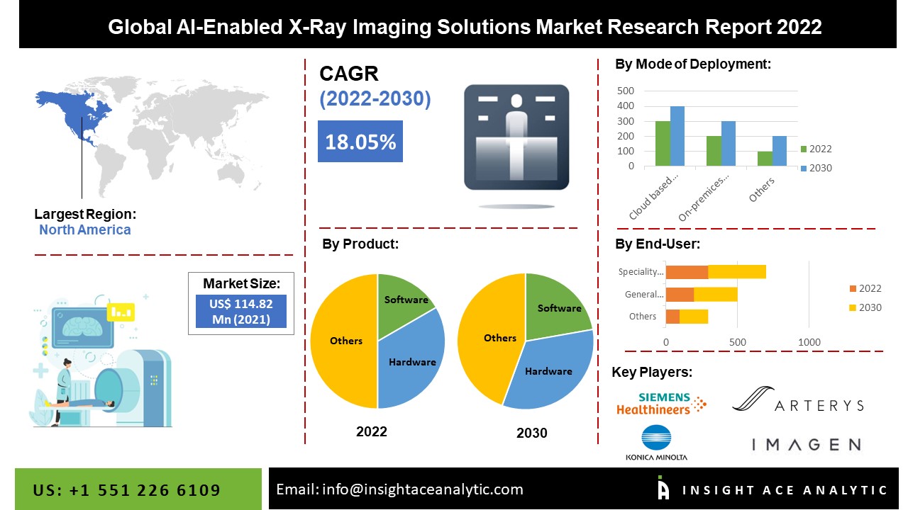 According to the latest research by InsightAce Analytic, the global AI-Enabled X-Ray Imaging Solutions market is valued at US$ 114.82 Million in 2021, and it is expected to reach US$ 508.32 Million by 2030, with a CAGR of 18.05% during a forecast period of 2022-2030.