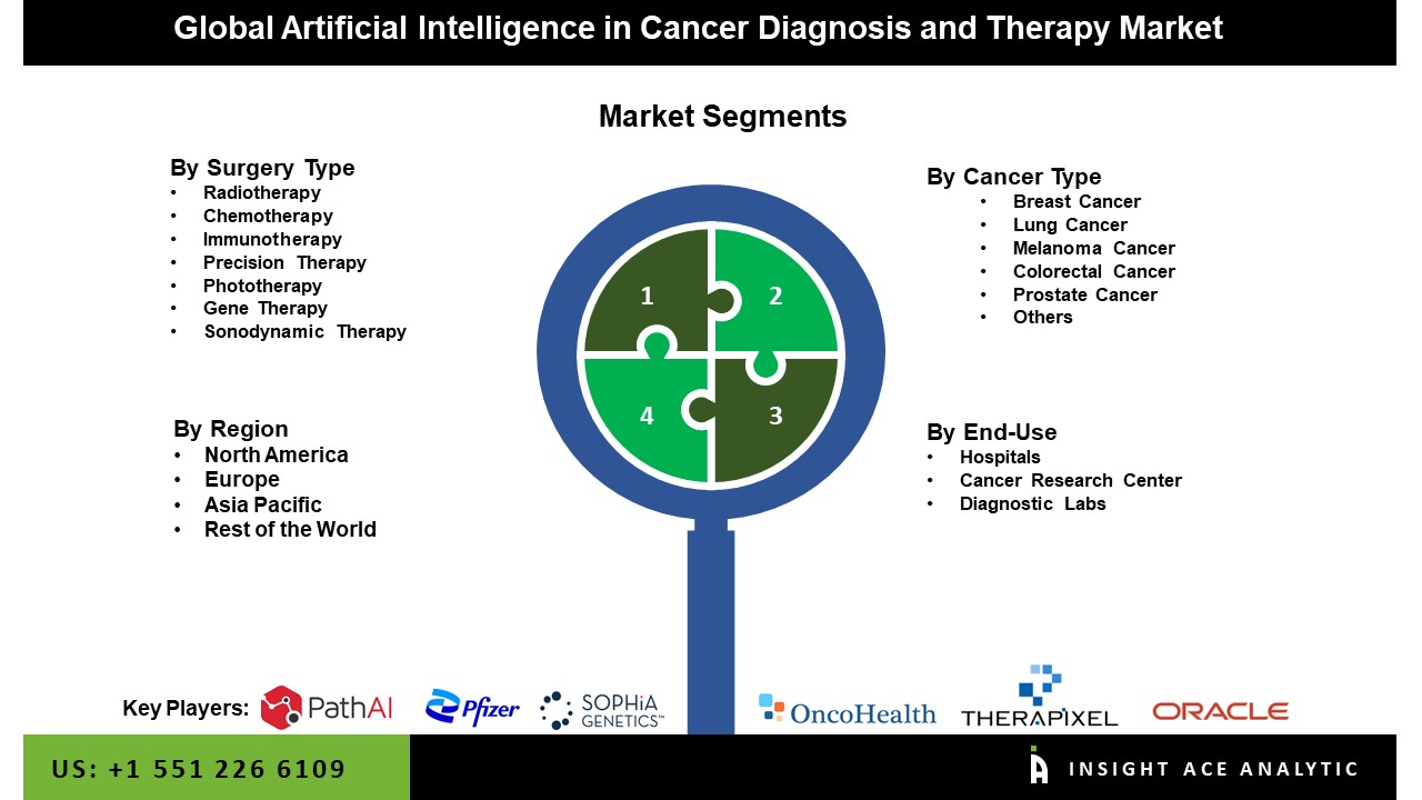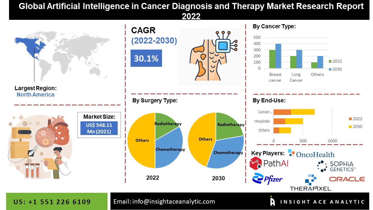 NEW JERSEY, NJ, USA, August 29, 2022 /EINPresswire.com/ -- InsightAce Analytic Pvt. Ltd. announces the release of a market assessment report on the "Global Artificial Intelligence in Cancer Diagnosis and Therapy Market- by Surgery Type (Radiotherapy, Chemotherapy, Immunotherapy, Precision Therapy, Phototherapy, Gene Therapy, and Sonodynamic Therapy), Cancer Type (Breast Cancer, Lung Cancer, Melanoma Cancer, Colorectal Cancer, Prostate Cancer, and Others), End-Use (Hospitals, Cancer Research Centre, and Diagnostic Labs), Trends, Industry Competition Analysis, Revenue and Forecast To 2030."