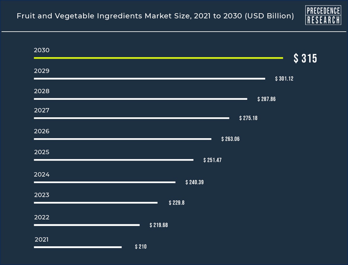 According to Precedence Research, the global fruit and vegetable ingredients market size is expected to be worth around USD 315 billion by 2030 and growing at a CAGR of 4.61% from 2022 to 2030.