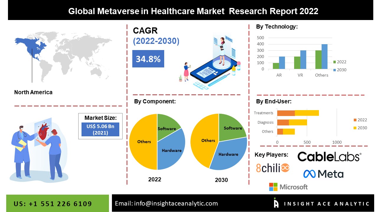 NEW JERSEY, NJ, USA, August 30, 2022 /EINPresswire.com/ -- InsightAce Analytic Pvt. Ltd. announces the release of a market assessment report on the "Global Metaverse in Healthcare Market- by Component (Software and Hardware) Technology (Augmented Reality (AR), Virtual Reality(VR), Artificial Intelligence(AI), and Mixed Reality(MR)), Devices (VR Headsets, AR Devices, and Mixed Reality Platforms), End-Users (Medical Training & Education Modules, Diagnosis, Designing ORs, Treatment, Surgical Training, Remote Monitoring, and Others), Trends, Industry Competition Analysis, Revenue and Forecast To 2030."