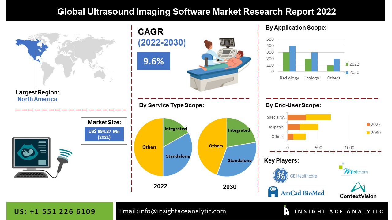 NEW JERSEY, NJ, USA, September 1, 2022 /EINPresswire.com/ -- InsightAce Analytic Pvt. Ltd. announces the release of a market assessment report on the "Global Ultrasound Imaging Software Market- by Service Types (Integrated, Standalone, and Next Generation/AI-based Software), Application (Radiology, OB/GYN, Urology, Cardiology, and Others (Orthopedic, etc.)), End-Users (Hospitals, Speciality Clinics, and Others (ASCs, Research Institutes, etc.)), Trends, Industry Competition Analysis, Revenue and Forecast To 2030."