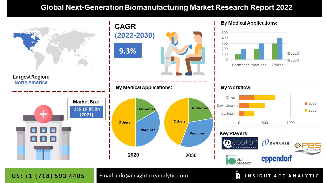 NEW JERSEY, NJ, USA, September 2, 2022 /EINPresswire.com/ -- Insight Analytics Pvt. Ltd. announces the release of a market assessment report on the "Global Next-Generation Biomanufacturing Market- by Medical Applications (Monoclonal Antibodies, Hormones, Vaccines, Recombinant Proteins and Other Applications), Products (Continuous Upstream Biomanufacturing Products, Single-Use Upstream Biomanufacturing Products and Downstream Biomanufacturing Products), Workflow (Upstream Biomanufacturing and Downstream Biomanufacturing), End-Users (Biopharmaceutical Companies, CMOs (Contract manufacturing organizations)/CDMOs (Contract Development and Manufacturing Organization) and Research Institutions), Trends, Industry Competition Analysis, Revenue and Forecast To 2030."