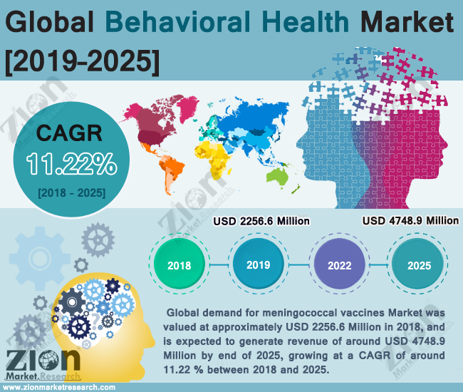 According to the report, global demand for Behavioral Health Market was valued at approximately USD 2256.6 Million in 2018, and is expected to generate revenue of around USD 4748.9 Million by end of 2025, growing at a CAGR of around 11.22 % between 2018 and 2025.