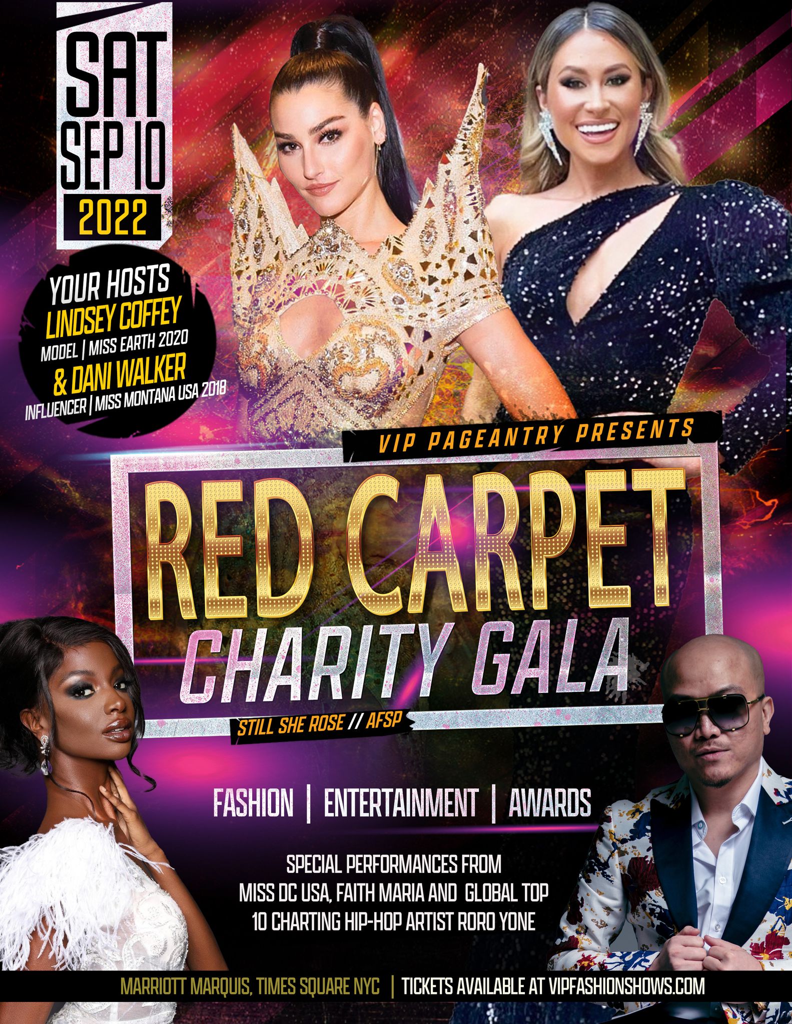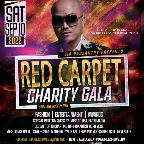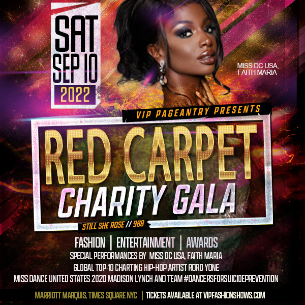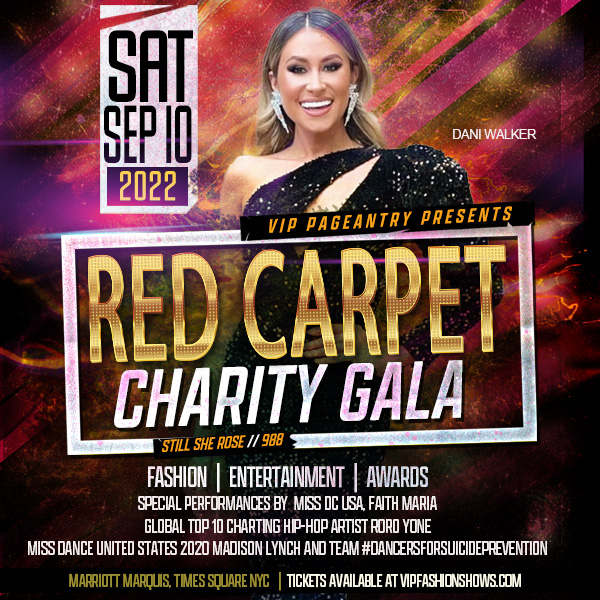 There will also be a VIP Red Carpet Charity Gala in support of Suicide Prevention, to promote the new 988 Crisis Hotline, and to raise money for the "Still She Rose" initiative at 8 pm on Saturday, September 10th. Special Guests include YouTube star Dani Walker, Miss Earth 2020, Lindsey Coffey, Mister Supranational 2022, Luis Daniel Galvez and many more. Awards will be presented to Miss Universe 2022, Harnaaz Sandhu, Celebrity Photographer Fadil Berisha, The Queen of Versailles, and Jackie Siegel.