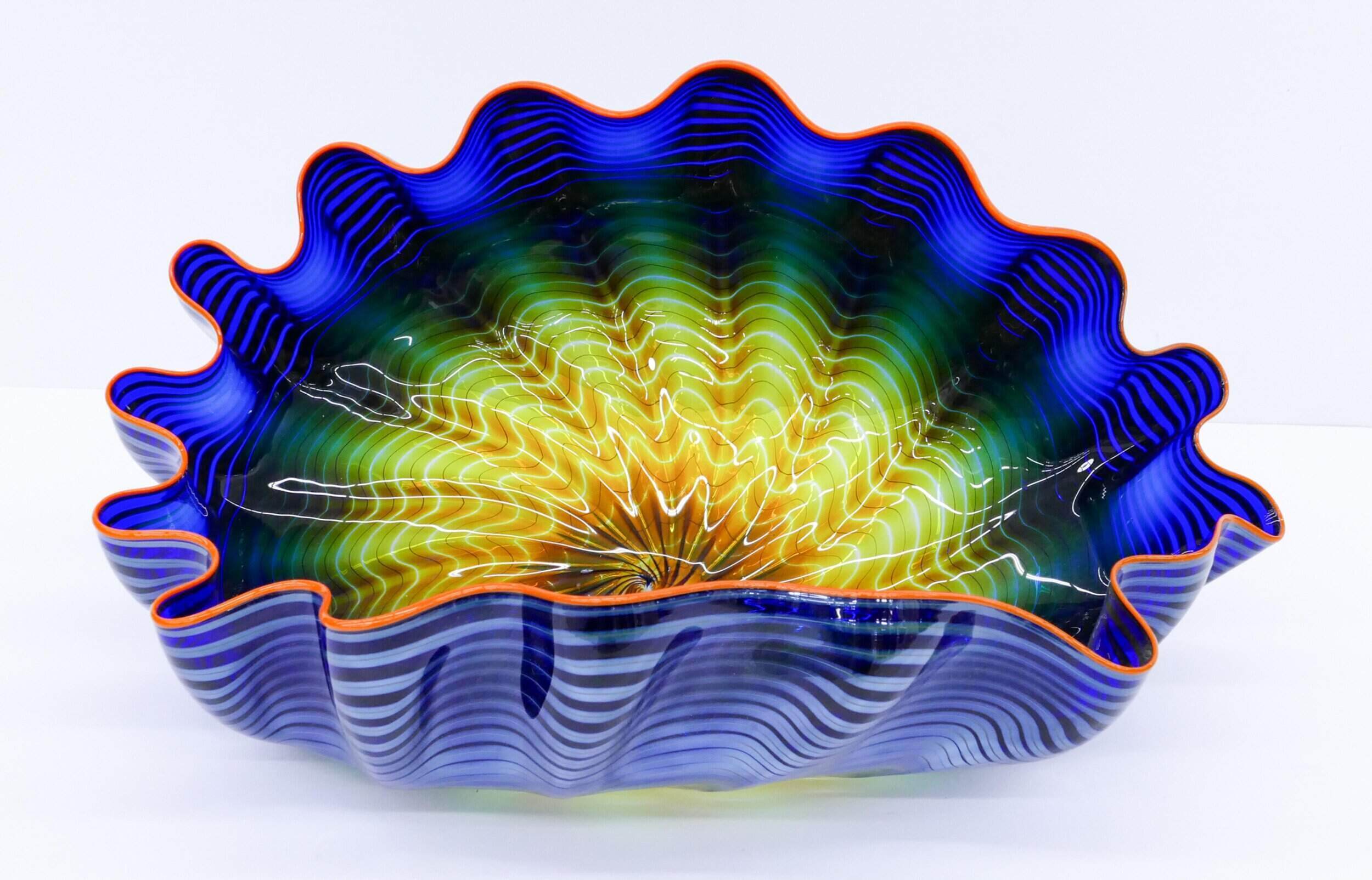 A large and impressive deep blue seaform blown glass creation by Dale Chihuly (Wash., b. 1941), titled Ultramarine Blue Seaform with Red Orange Lip Wrap (1995), is expected to change hands for $6,000-$9,000. The work, signed and dated on the bottom, is 11 inches by 21 inches by 12 inches and is accompanied by a copy of the original receipt from Chihuly Studio, from 1995.