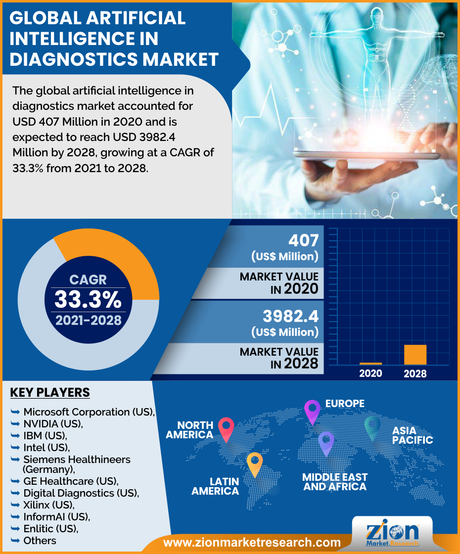 The global artificial intelligence in the diagnostics market was worth USD 407 million in 2020 and expanding at a 33.3% CAGR from 2021 to 2028.