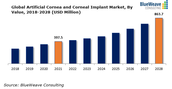 A recent study conducted by the strategic consulting and market research firm, BlueWeave Consulting, revealed that the Global Artificial Cornea and Corneal Implant Market was worth USD 397.5 million in the year 2021. The market is projected to grow at a CAGR of 12%, earning revenues of around USD 863.7 million by the end of 2028. The Global Artificial Cornea and Corneal Implant Market are booming because the willingness of the consumer to spend money on eye care is credited with driving the expansion in the artificial cornea implant market. Additionally, the main driver of the market's growth is the rise in ophthalmic illnesses such as keratoconus, Fuchs dystrophy, and viral keratitis. In addition, rising healthcare costs for eye treatment in emerging nations are fueling the expansion of the artificial cornea implant market globally. Additionally, the market can expand as a result of factors including the rise in surgical procedures and the demand for innovative treatment methods. The development of the global artificial cornea implant market, however, is threatened by the high cost of cornea implant surgeries. Additionally, complications from corneal procedures hinder the widespread use of corneal implants.
