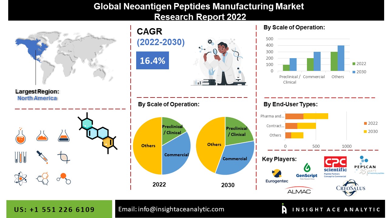 NEW JERSEY, NJ, USA, September 6, 2022 /EINPresswire.com/ -- InsightAce Analytic Pvt. Ltd. announces the release of a market assessment report on the "Global Neoantigen Peptides Manufacturing Market by End-Users (Pharmaceutical/Vaccine developers companies, Academic and Research Institutes, Contract Research Organizations (CRO) by Scale of operations (Research/Preclinical, Clinical, Commercial), - Industry Competition Analysis, Future Trends, Revenue and Forecast To 2030."