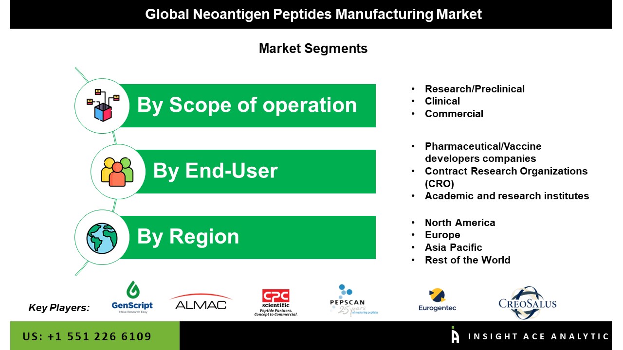 Major market players operating in the Neoantigen Peptides Manufacturing market include CPC Scientific Inc, Polypeptide group, Genscript Biotech, Kaneka Eurogentec S.A., Vivitide, Almac, BCN Peptides, Creative Peptides, Pepscan, Provepharm, Creosalus, Gyros Protein Technologies and Other Prominent Players.