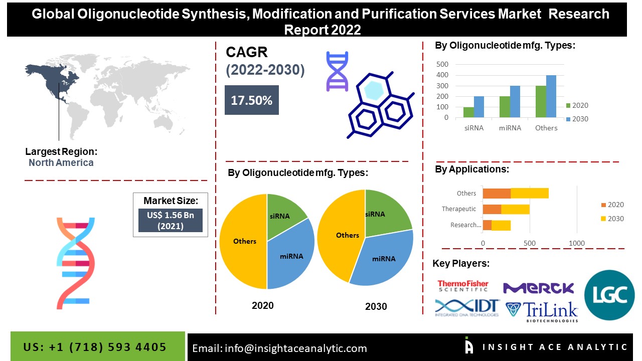 NEW JERSEY, USA, September 6, 2022 /EINPresswire.com/ -- Insight Analytics Pvt. Ltd. announces the release of a market assessment report on the Global Oligonucleotide Synthesis, Modification and Purification Services Market Oligonucleotide Mfg. Type (siRNA, Antisense Oligonucleotides, miRNA, And Other Oligonucleotides), Applications (Research And Diagnostic, Therapeutic, And Contract Manufacturing (OEM)), Operation Scale (Intermediate-Scale Oligonucleotide Synthesis, Large-Scale Oligonucleotide Synthesis, And Small-Scale Oligonucleotide Synthesis), Therapeutic Areas (Eye Disorders, Oncological Disorders, Metabolic Disorders, Autoimmune Disorders, And Other Therapeutic Areas), End-users (Pharmaceutical & Biotechnology Companies, Contract Research Organizations (CROS),Hospitals & Diagnostic Laboratories, And Contract Manufacturing Organizations (CMOS), And Academic Research Institutes) – Future Trends, Industry Competition Analysis, Revenue, and Forecast till 2030."