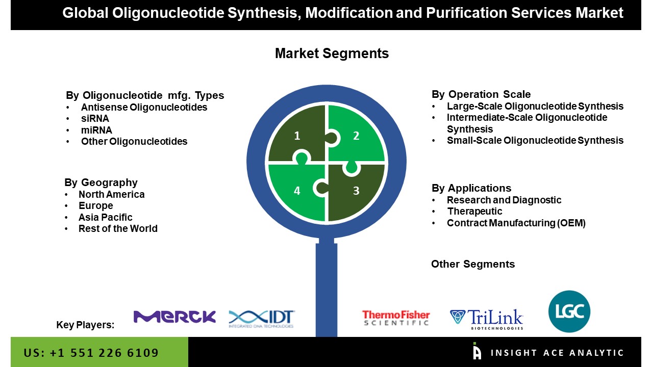 Major market players operating in the Oligonucleotide Synthesis, Modification, and Purification Services market include Integrated DNA Technologies, Ajinomoto Bio-Pharma Services, Kaneka Eurogentec, LGC Biosearch Technologies, MilliporeSigma, BioSpring, Microsynth, Nitto Denko Avecia, CordenPharma, Eurofins Scientific SE, Thermo Fisher Scientific Inc., Agilent Technologies, Inc., GE Healthcare, TriLink Biotechnologies, Bio-synthesis Inc., GeneDesign, Inc., ATDBio Ltd, Burkert UK Limited and Almac Group.