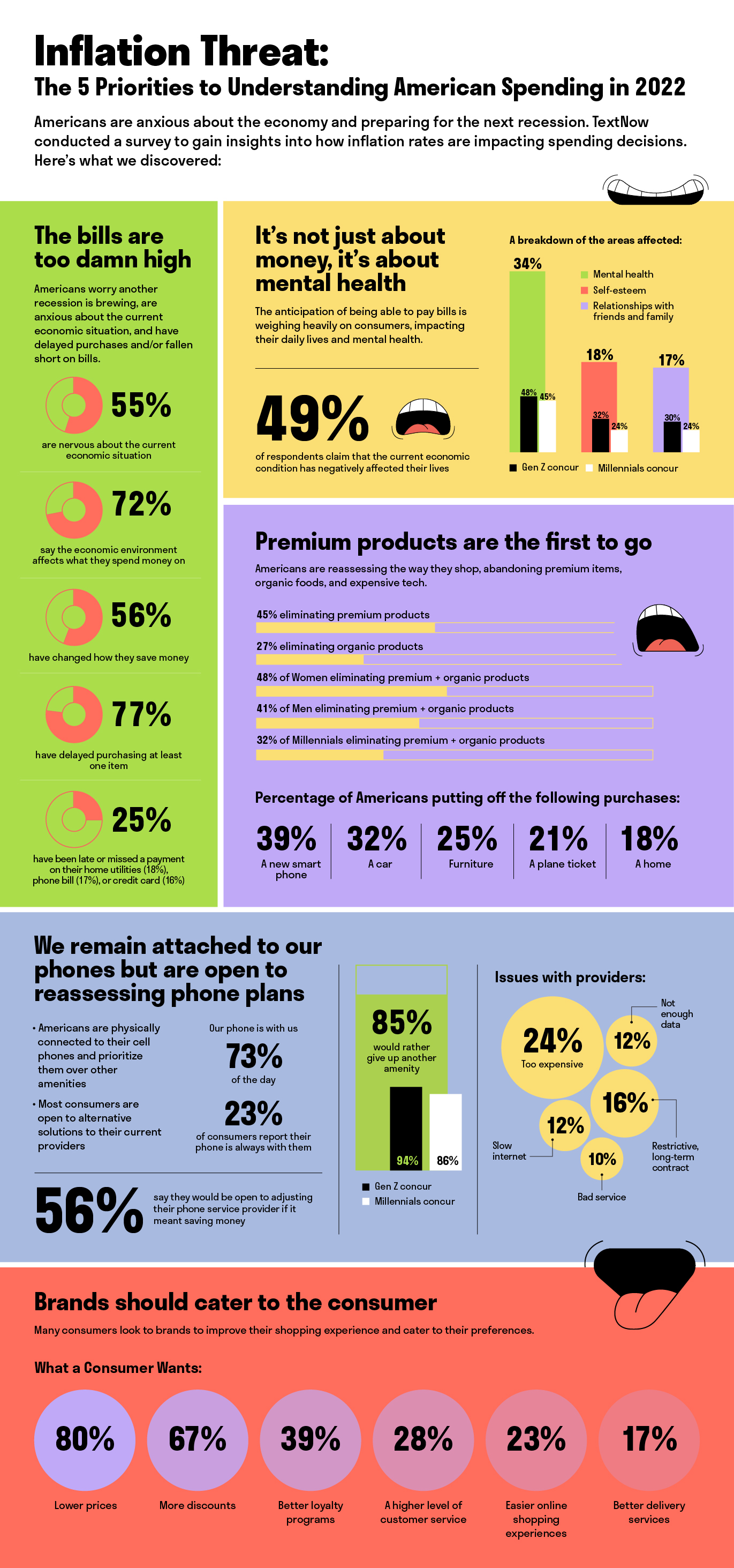 “With the challenges facing consumers today, many Americans are feeling anxious and they are telling us it’s affecting their spending decisions,” said Derek Ting, co-founder and CEO of TextNow. “As part of our mission to democratize phone service for everyone, we have close relationships with the group most affected by inflation and we’ve found actionable ways for brands to help relieve the pressure consumers are facing.”