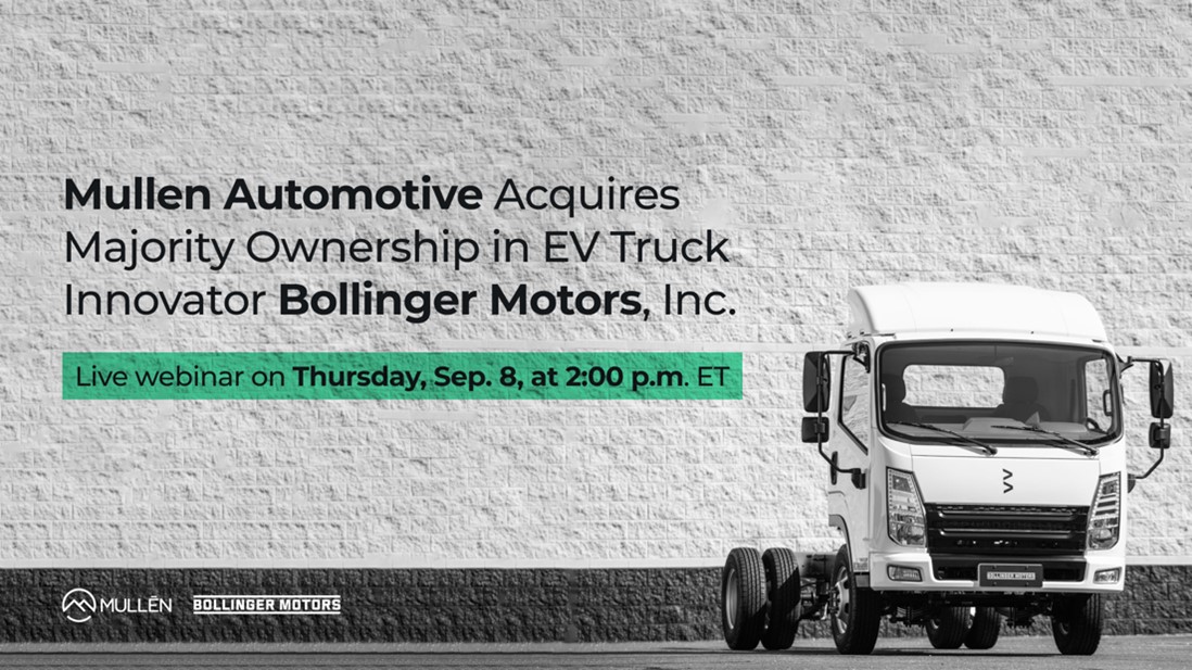 BREA, Calif., Sept. 08, 2022 (GLOBE NEWSWIRE) -- via InvestorWire -- Mullen Automotive, Inc. (NASDAQ: MULN) (“Mullen” or the “Company”), an emerging electric vehicle (“EV”) manufacturer, announces that it will be conducting a live webinar today at 2 p.m. ET., to discuss the majority acquisition of EV Truck Innovator Bollinger Motors, Inc.