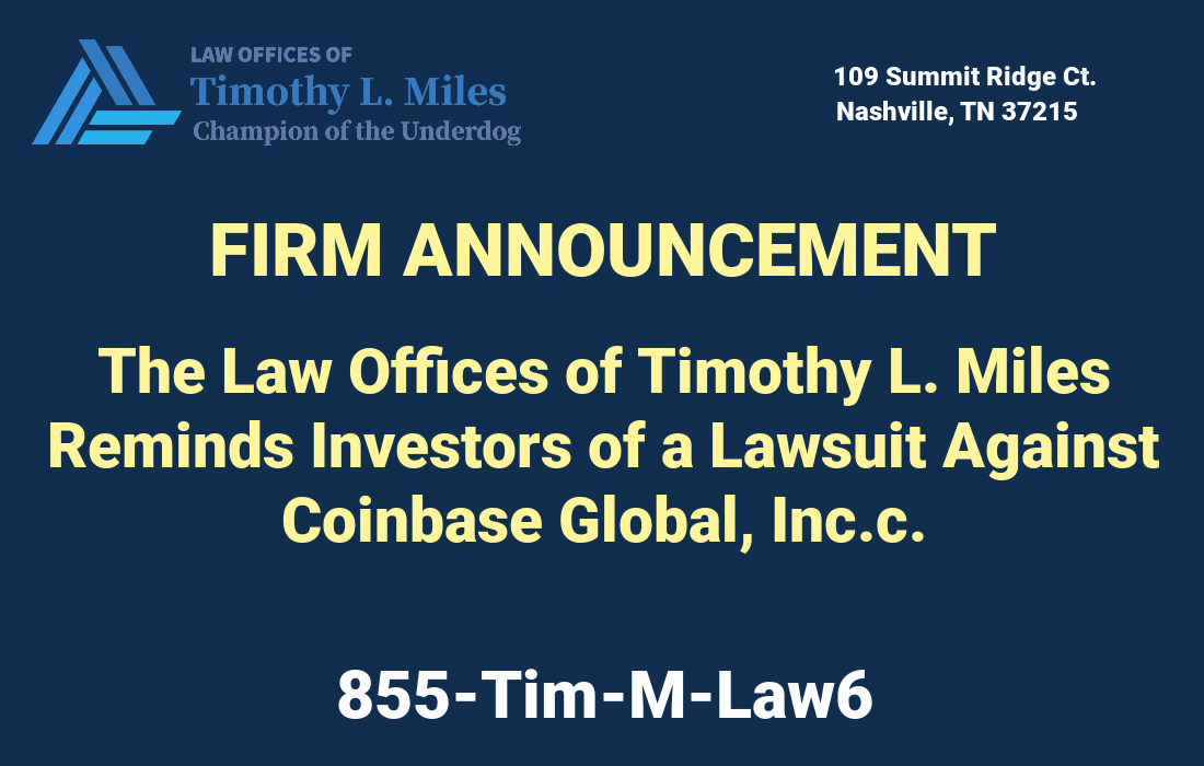 COINBASE GLOBAL ALERT: The Law Offices of Timothy L. Miles Reminds Investors of a Lawsuit Against Coinbase Global, Inc.