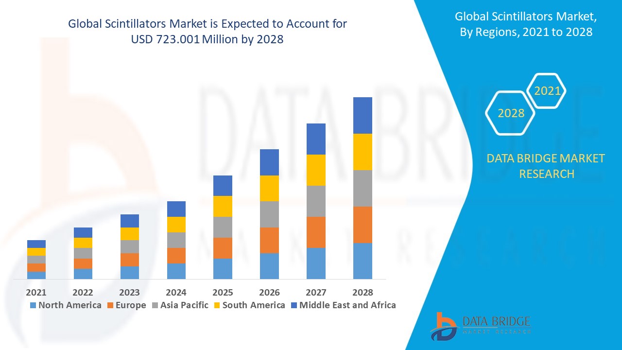 Growing focus on the technological advancements by the major manufacturers, rising number of nuclear power plants in Asian countries, and increasing application of scintillators for a wide range of end user applications such as healthcare sector, nuclear power plants, manufacturing industries and other applications are the major factors attributable to the growth of scintillators market. Data Bridge Market Research analyses that the scintillators market will exhibit a CAGR of 5.35% for the forecast period of 2021-2028. Therefore, the scintillators market value will rocket up to USD 723.001 million by 2028.