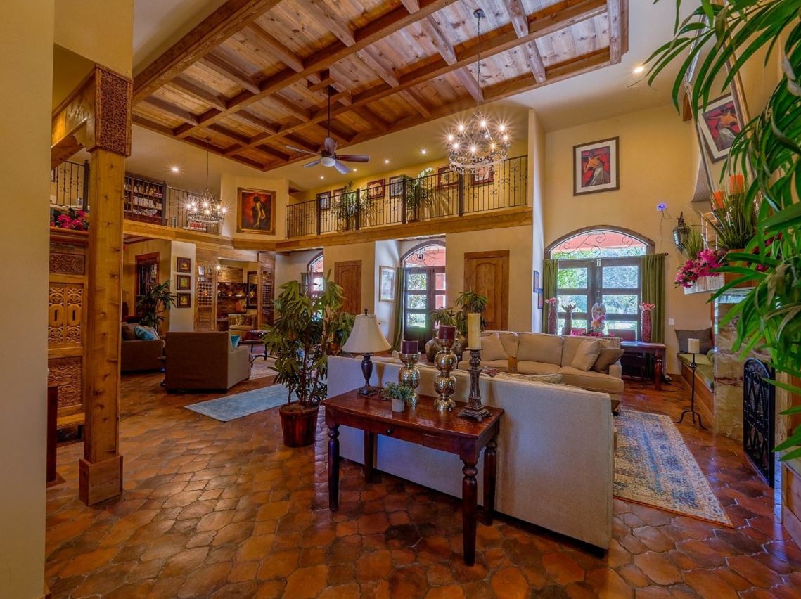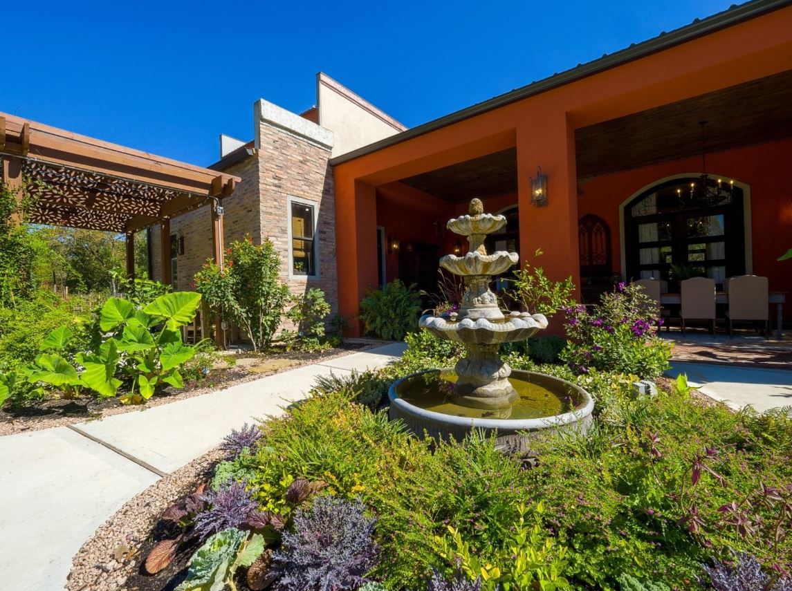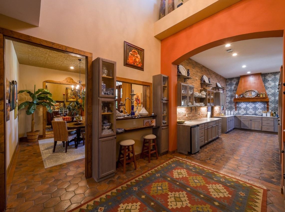 Bright, colorful tile and stonework accent the high ceilings and natural setting while all the modern amenities await you as you enter the home. The 7,000 square feet feature a vast great room, secluded master suite, wine nook, and guest suite. Finding a comfortable spot within the home is easy, as there are multiple options for relaxing, from the wine nook family room to the coffee bar and out to the spacious back porch with its lush landscaping.