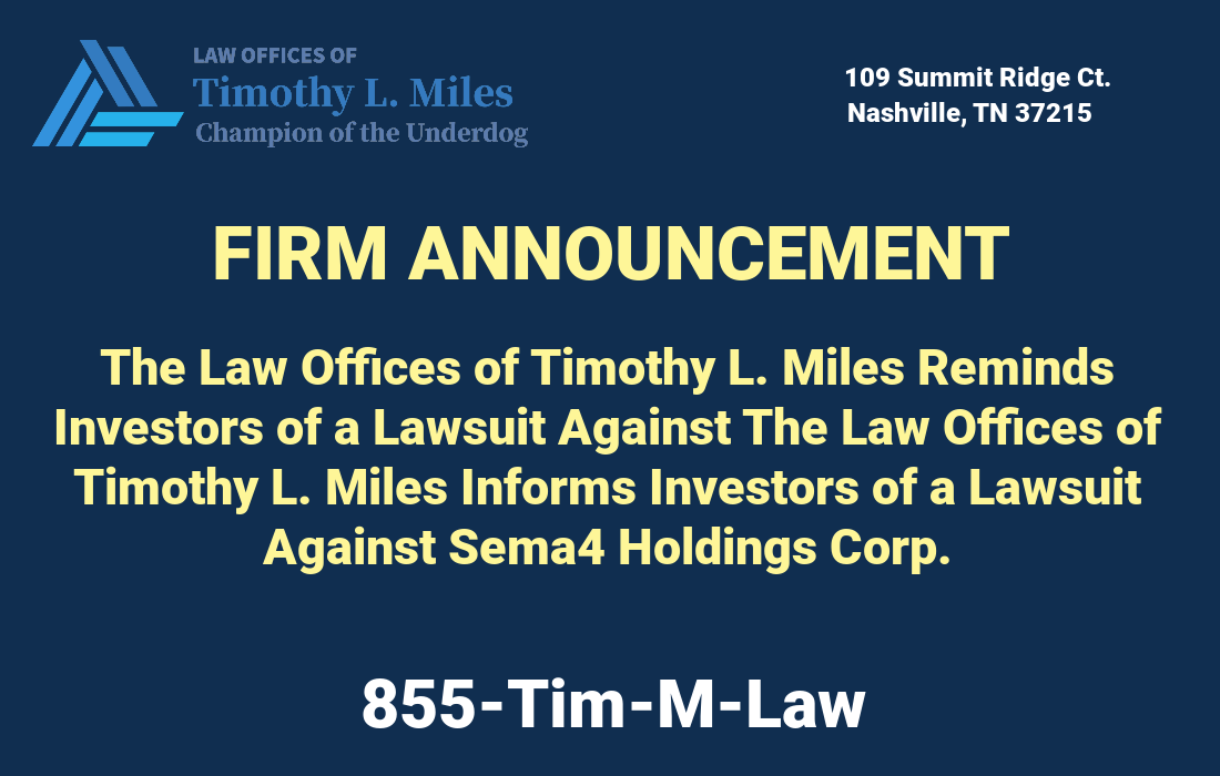 If you purchased Sema4 securities, have information, or have any questions concerning this announcement or your rights or interests with respect to these matters, please click here for more information or contact Timothy L. Miles, Esquire, at 615-587-7384, Toll-Free at 855-846-6529, or by email to tmiles@timmileslaw.com. If you inquire by email please include your mailing address, telephone number, and the number shares owned.