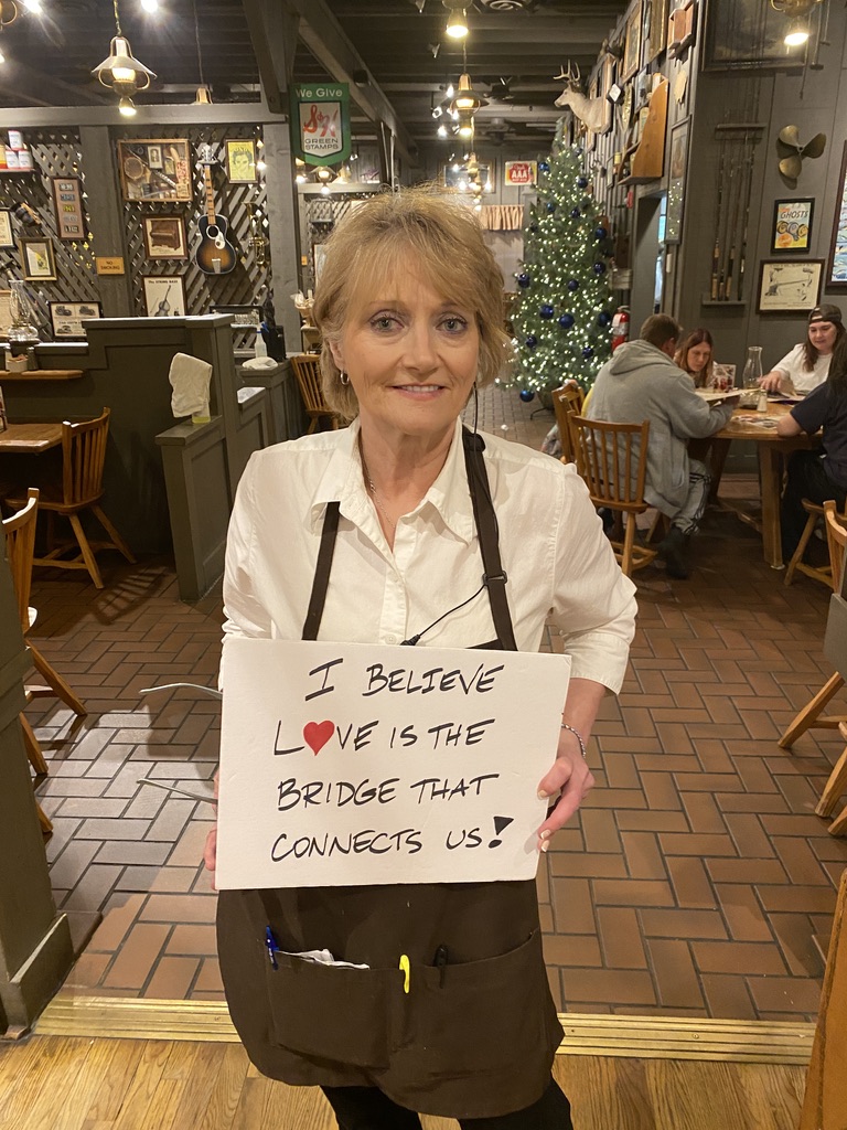 There were some particularly heartwarming encounters along the way that moved Glodean to the core and confirmed her belief that there is hope after all, and that people want love and connection. Here are a few examples: At the Cracker Barrel Restaurant along Highway 20, the hostess was excited to be a part of Glodean's project. "Sure," the hostess said, "I'm positive there's more that connects us than separates us. We don’t have to always agree with one another to love one another.”