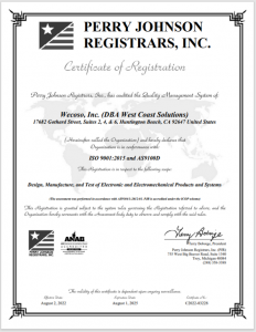 West Coast Solutions announced that they have attained ISO 9001:2015 and AS9100D Quality Registration Certifications.