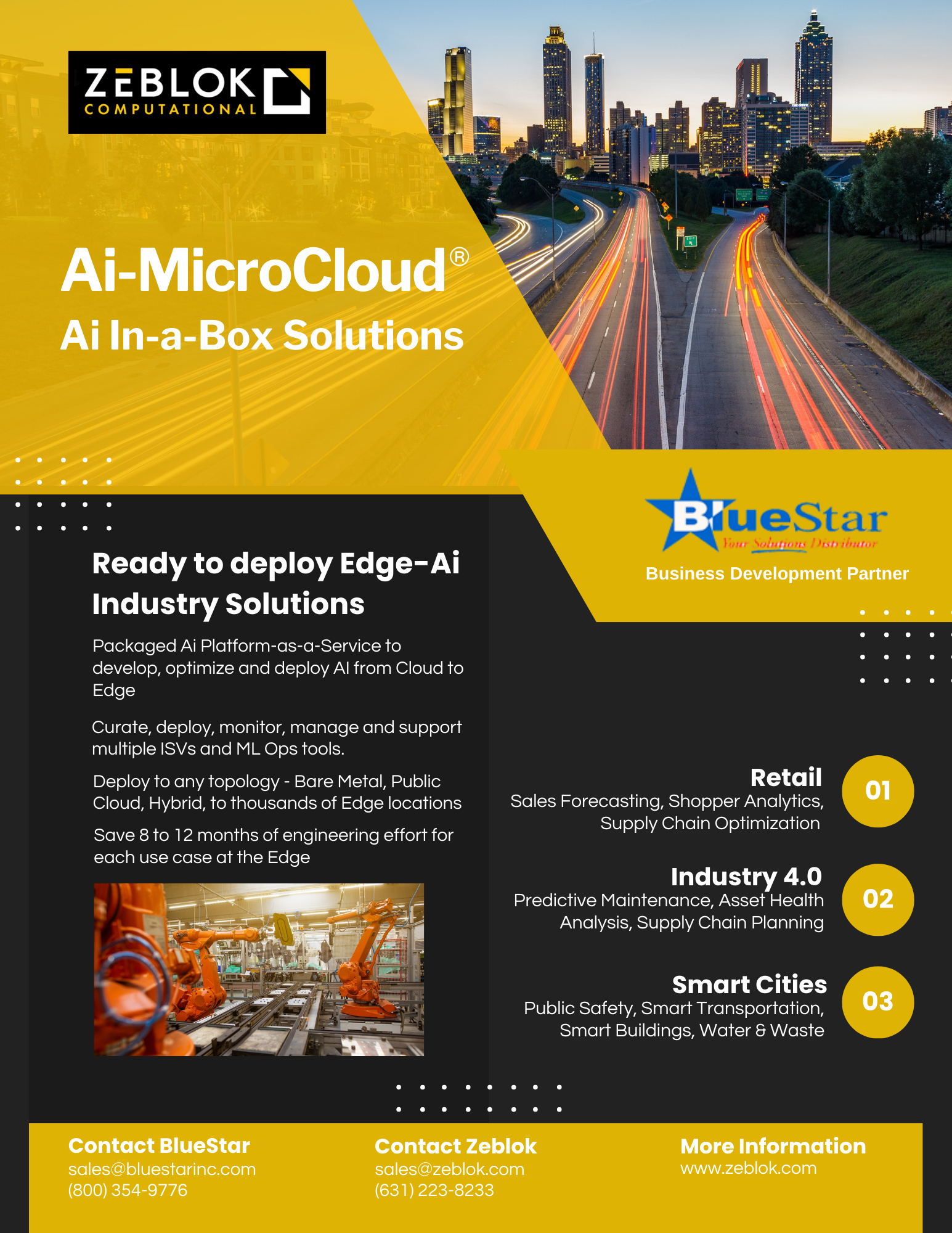 “We are excited to kick off a business development relationship with Zeblok. It’s the start of a unique AI offering available to BlueStar customers.,” said Dean Reverman, Vice President of Marketing at BlueStar, “Zeblok’s Ai-MicroCloud® with the Ai-AppStore will enable BlueStar VARs to differentiate their business offerings by addressing deployment problems in a cost-effective and simplified manner. Bundled with world class BlueStar OEM server, storage, and networking products, the Zeblok solution can be a game changer for our VARs.”