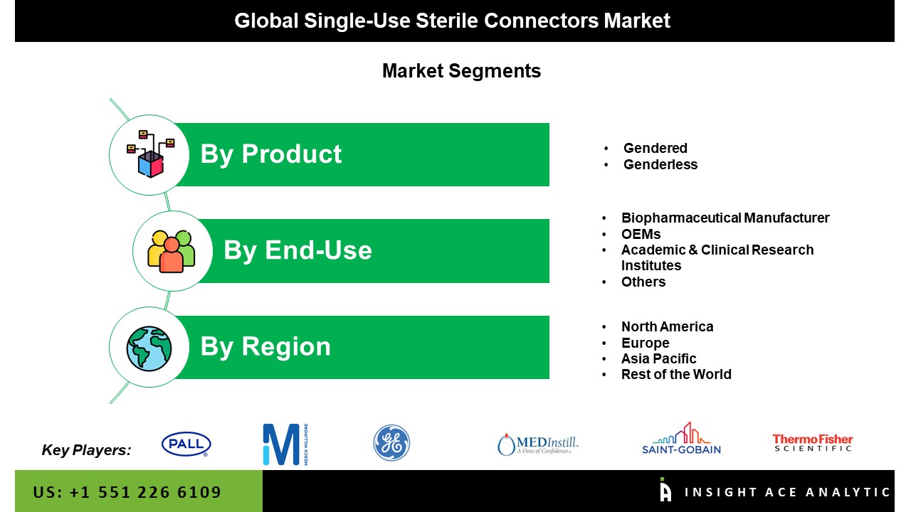 Major market players operating in the Single-Use Sterile Connectors market include MEDInstill, Corning Incorporated, Thermo Fisher, and Danaher Corporation, Vante, JM BIO CONNECT, PBS Biotech, Inc, ENTEGRIS, INC., LONZA, Pall Life Sciences, Merck Millipore, General Electric, Saint Gobain, Sartorius Stedim Biotech, CPC (Colder Products Company), Medtech Devices, Advin Healthcare, Med Solution, Laproworld Instrument Company, Msn Enterprises, and Piomed Surgical Industries.