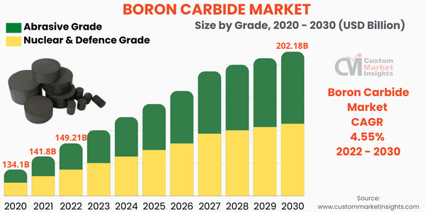 Sandy, Utah, USA, Sept. 13, 2022 (GLOBE NEWSWIRE) -- Custom Market Insights has published a new research report titled "Boron Carbide Market Size, Share, Growth Analysis Report By Grade (Abrasive Grade, Nuclear & Defence Grade), By Type (Powder, Paste, Grains), By Application (Industrial, Nuclear, Defence), and By Region - Global Industry Overview, Statistical Data, Competitive Intelligence, Trends, Outlook, and Forecast 2022–2030" in its research database.