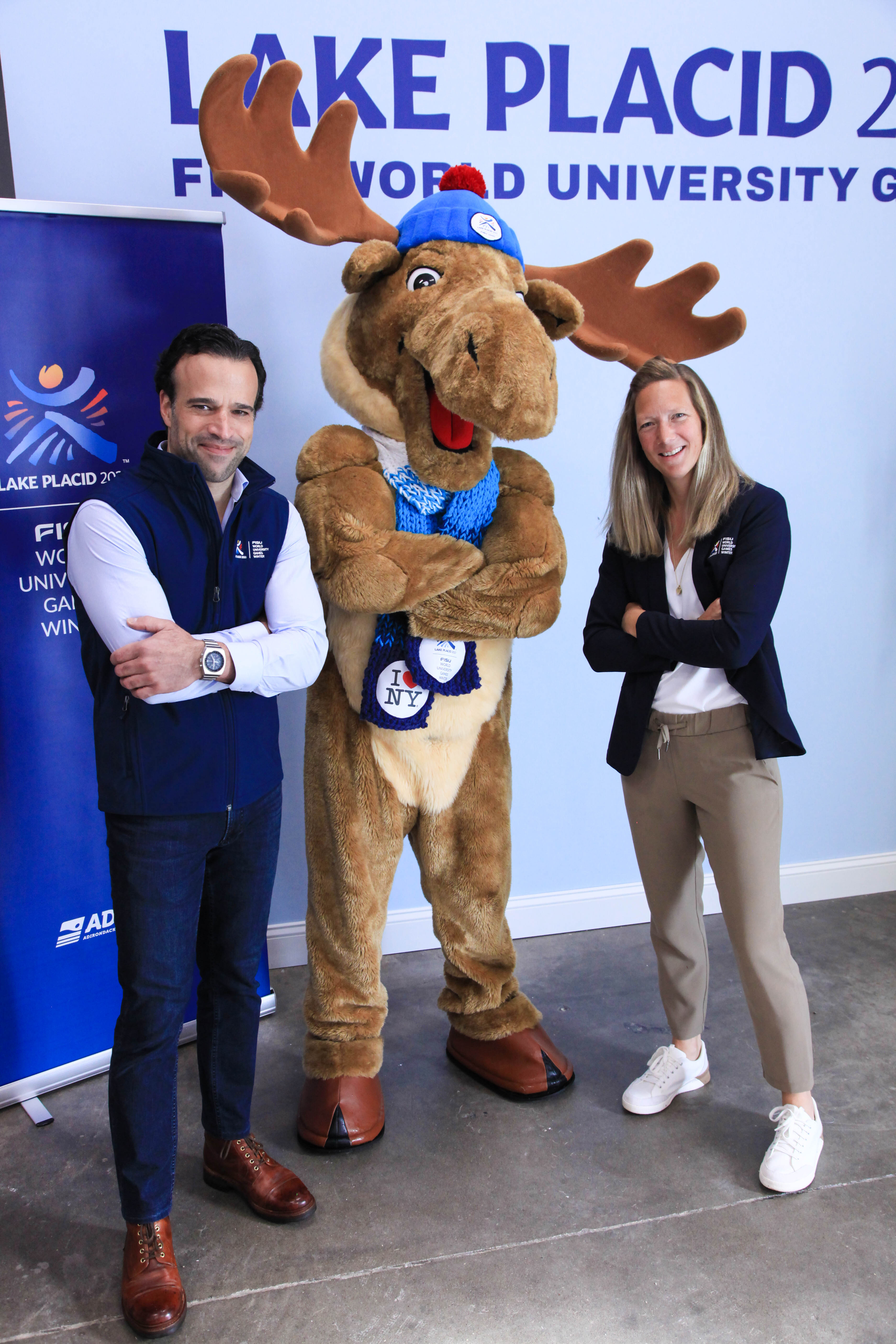PHOTO Courtesy: Adirondack Sports Council. Photo features Serge Abergel, chief operating officer, Hydro-Quebec Energy Services (U.S.) Inc, Adirondack Mac, the official Mascot of the Lake Placid 2023 FISU World University Games, Ashley Walden, executive director of the Adirondack Sports Council, the Lake Placid 2023 FISU World University Games' Organizing Committee
