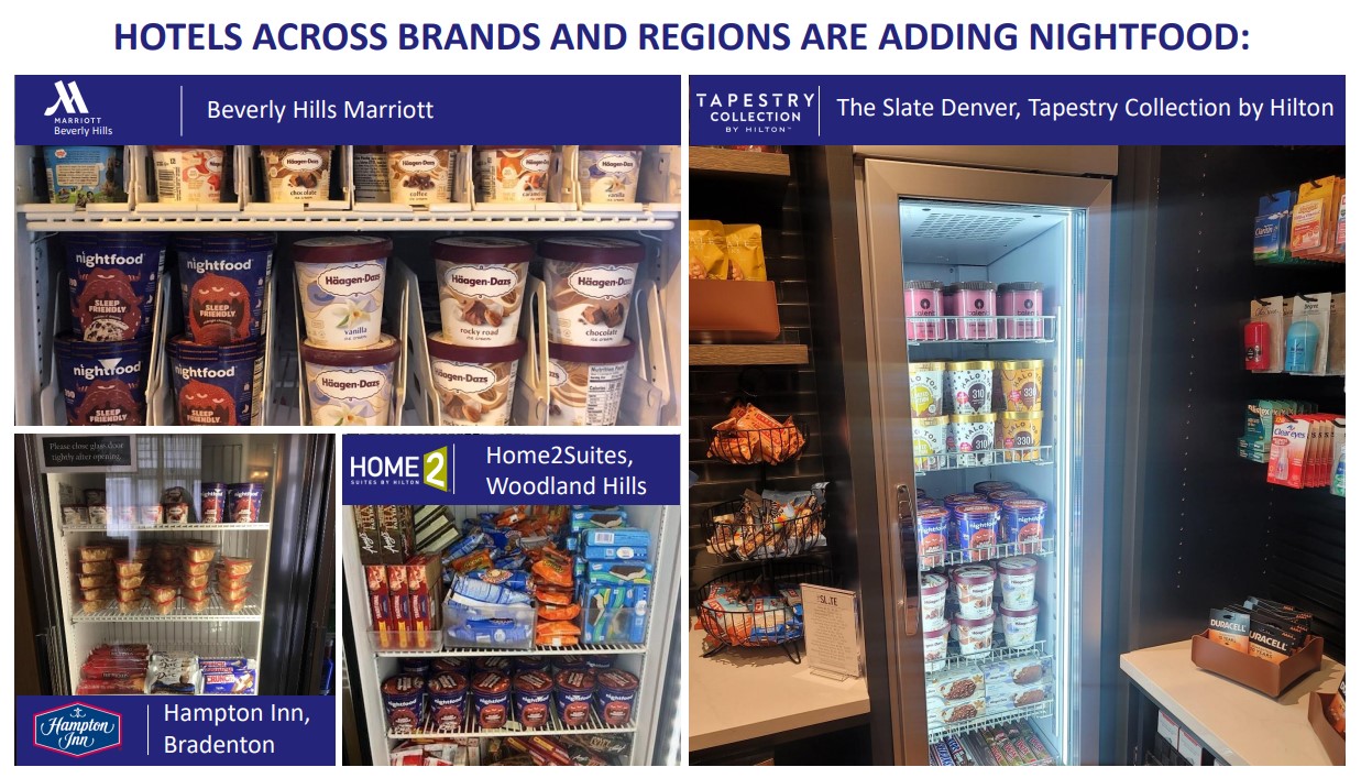 Nightfood has since secured distribution in select locations of many of the largest hotel chains in the world, including Marriott, Holiday Inn, Holiday Inn Express, Hyatt House, Hyatt Place, Crowne Plaza, Best Western, Fairfield Inn, Candlewood Suites, Ramada, La Quinta by Wyndham, SpringHill Suites, Sonesta, Clarion, and many more.