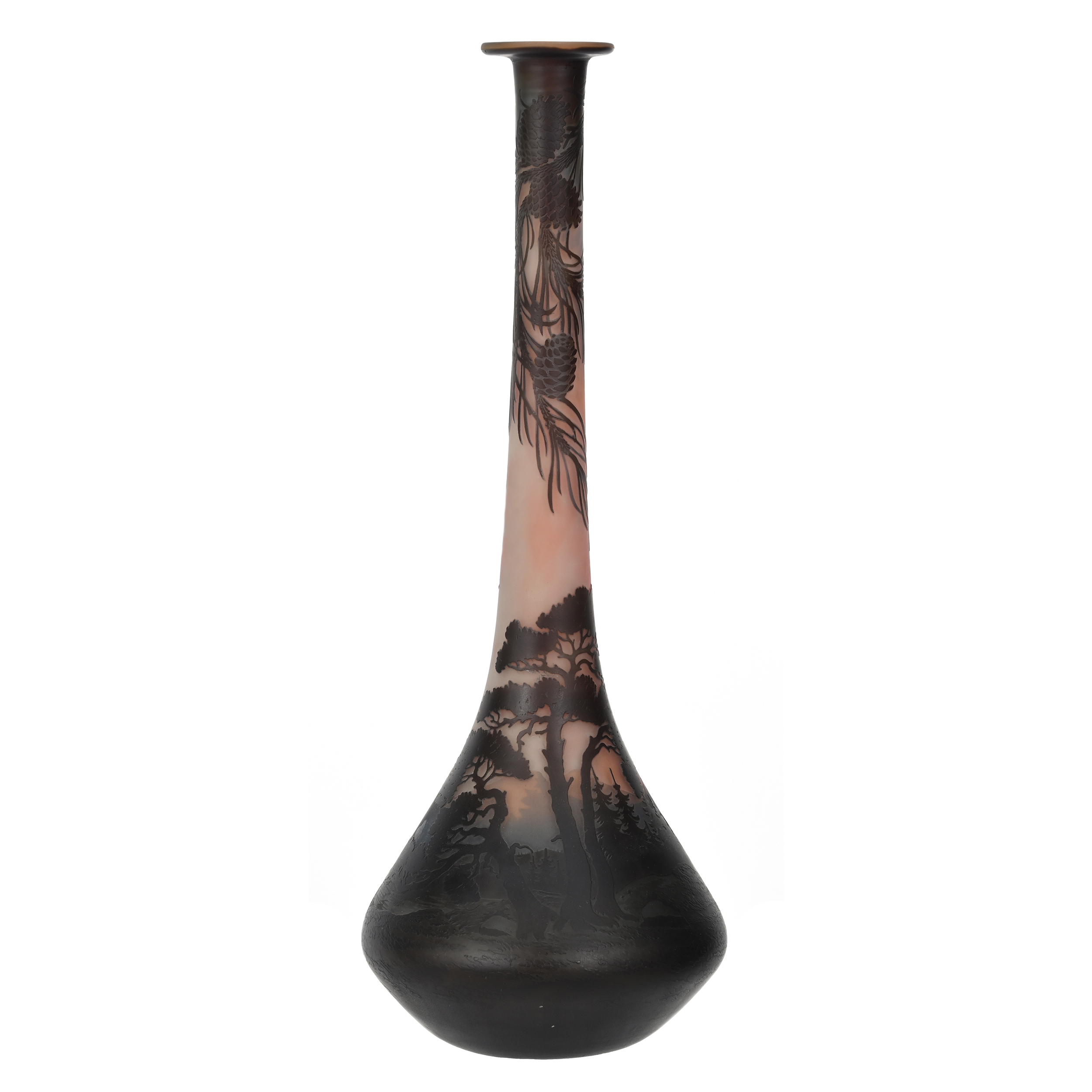 • A signed Muller Fres Luneville French cameo vase, 19 ¾ inches in height, white and pink ground with dark cameo curved overlay of a beautiful mountain, tree and pinecone design.