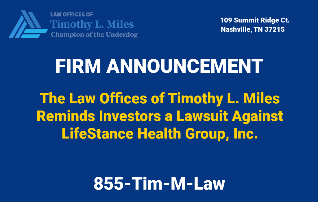 If you purchased LifeStance Health securities, have information, or have any questions concerning this announcement or your rights or interests with respect to these matters, please click here for more information or contact Timothy L. Miles, Esquire, at 615-587-7384, Toll-Free at 855-846-6529, or by email to tmiles@timmileslaw.com. If you inquire by email please include your mailing address, telephone number, and the number shares owned.