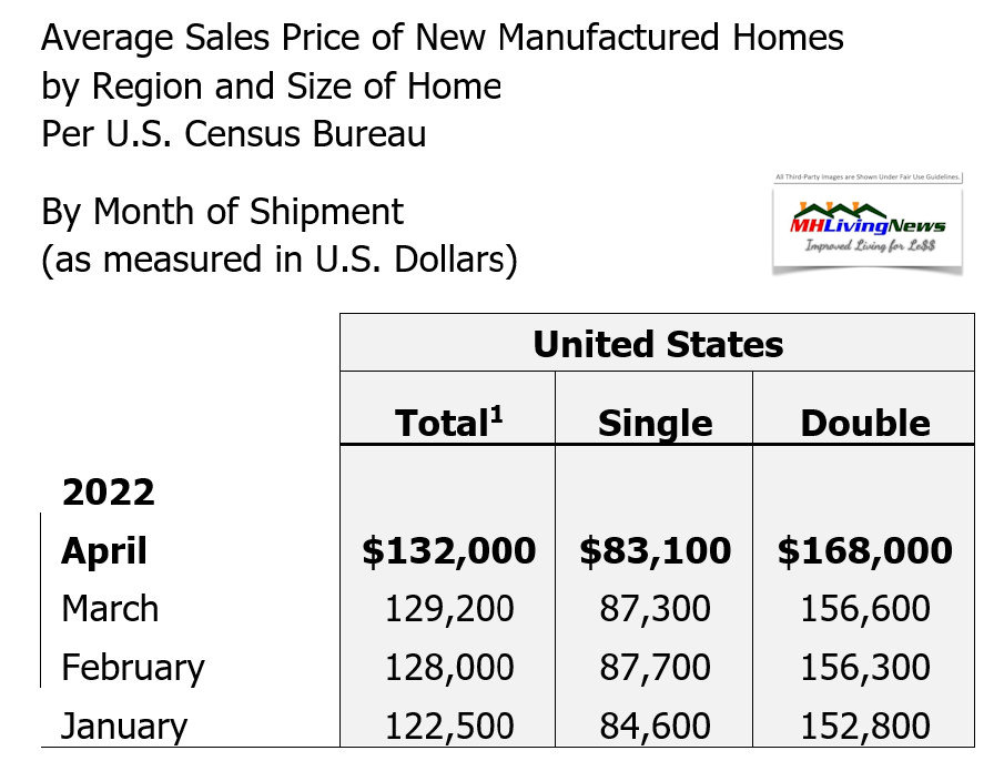 The third section of the MHLivingNews report entitled: "Just the Facts – Latest New Manufactured Home Sales, Production, and Shipment Data Nationally and State-by-State – Reported in September 2022 for July 2022 Data and Trends" covers the most recent available U.S. Census Bureau data, facts, and trends that reveal the the ‘average’ cost of a new manufactured home (without land) nationally and regionally. The average price per home on a regional and national basis in part of the third segment of the popular report.