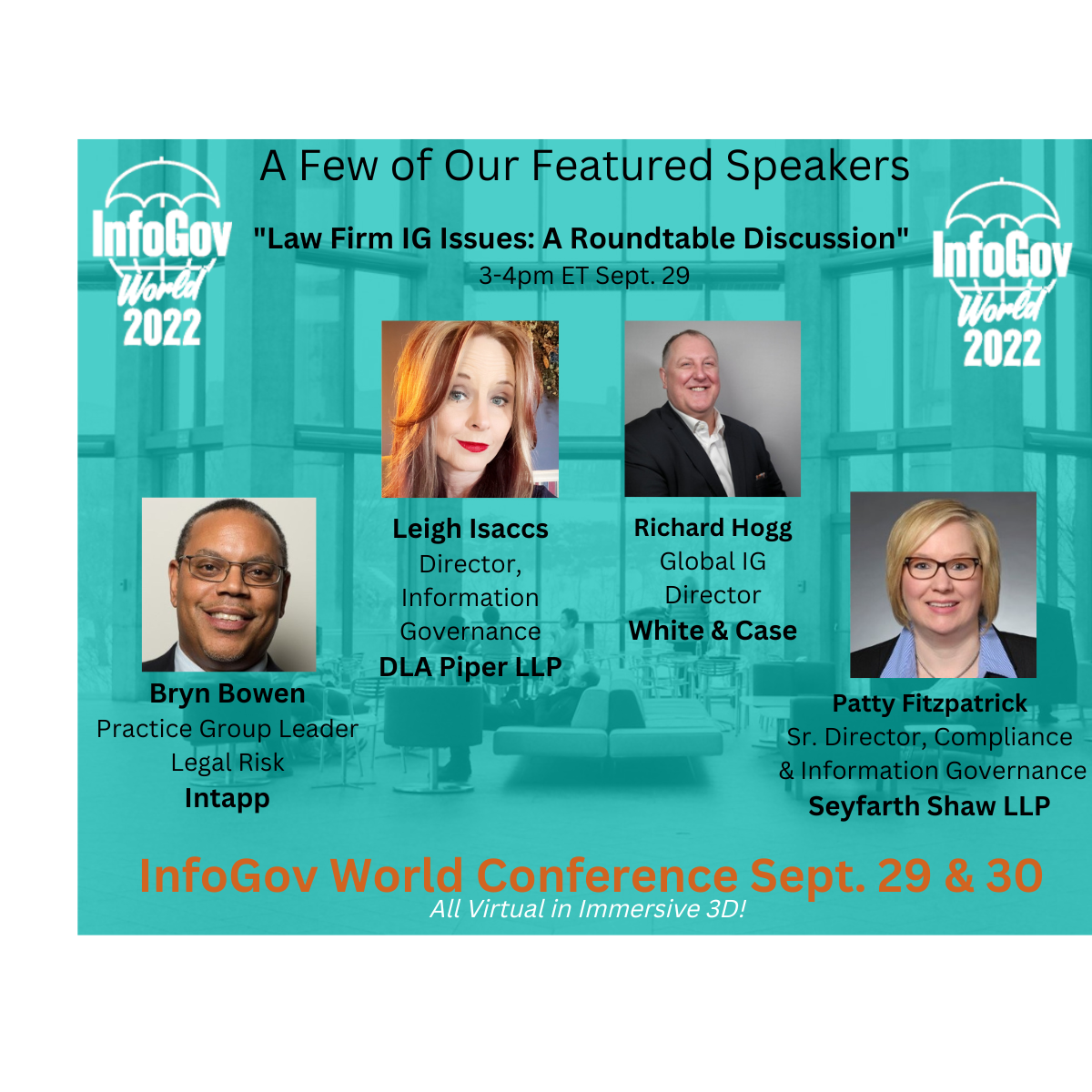 The "Law Firm Information Governance Issues" panel discussion will be held online from 3-4pm ET on Thursday, September 29. Panelists include: Leigh Isaacs, Director, Information Governance at DLA Piper LLP; Richard Hogg, Global Information Governance Director at White & Case LLP; Patty Fitzpatrick, Senior Director, Compliance and Information Governance and Seyfarth Shaw, LLP; and Bryn Bowen, Practice Group Leader - Legal at Intapp.