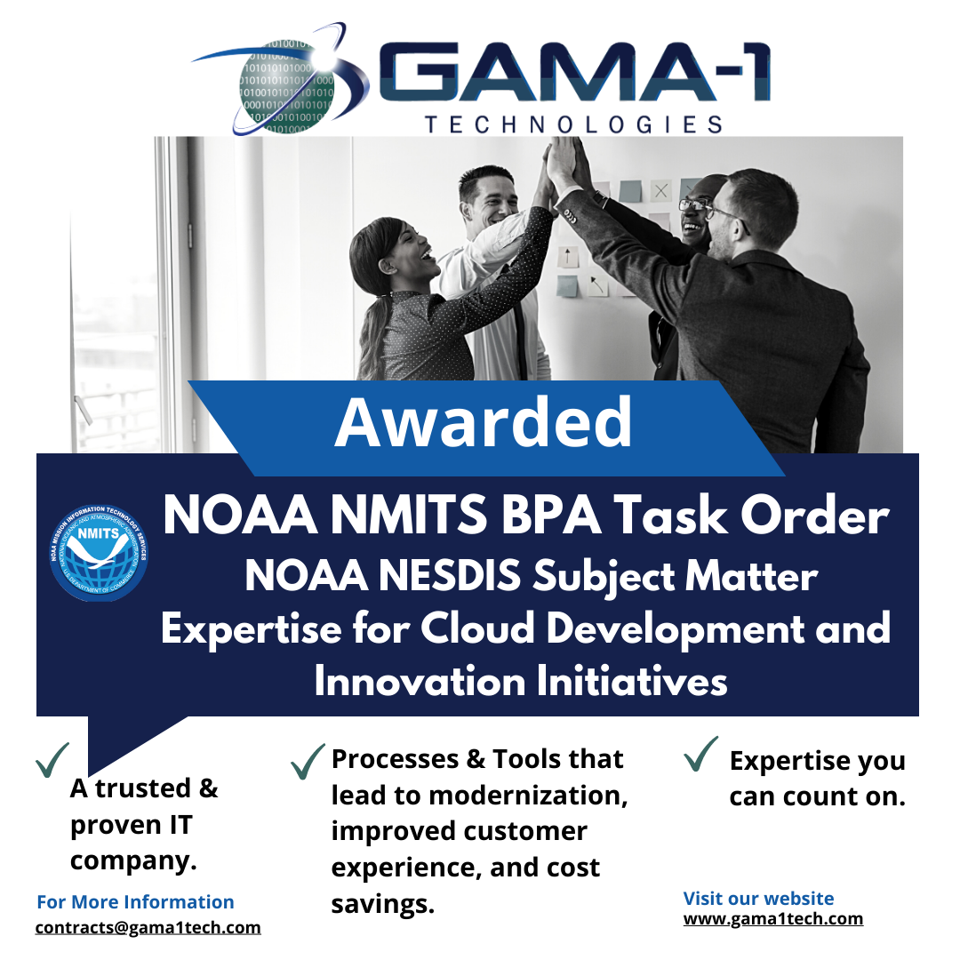GAMA-1 is honored that NESDIS chose our team with their vote of high confidence of success in our proposed technical and management approach. An approach that entails providing the subject matter expertise to increase efficiency, eliminate redundancy, modernize the NESDIS Ground Enterprise (NGE) technology, and reduce the total cost of ownership of all NGE systems. Our Cloud SMEs have supported multi-tier development, architecture, and deployment of Cloud IT systems, from the inception of the NESDIS cloud pilot project to the delivery of the operational NESDIS Common Cloud Framework to the rapidly expanding development efforts supported by NESDIS Cloud-sandbox Infrastructure Services. We celebrate this contract award with our team members, who have extensive experience deploying various Cloud IT services, collectively designing, deploying, and managing dozens of multi-account and multi-tier solutions for public, private, and non-profit customers.