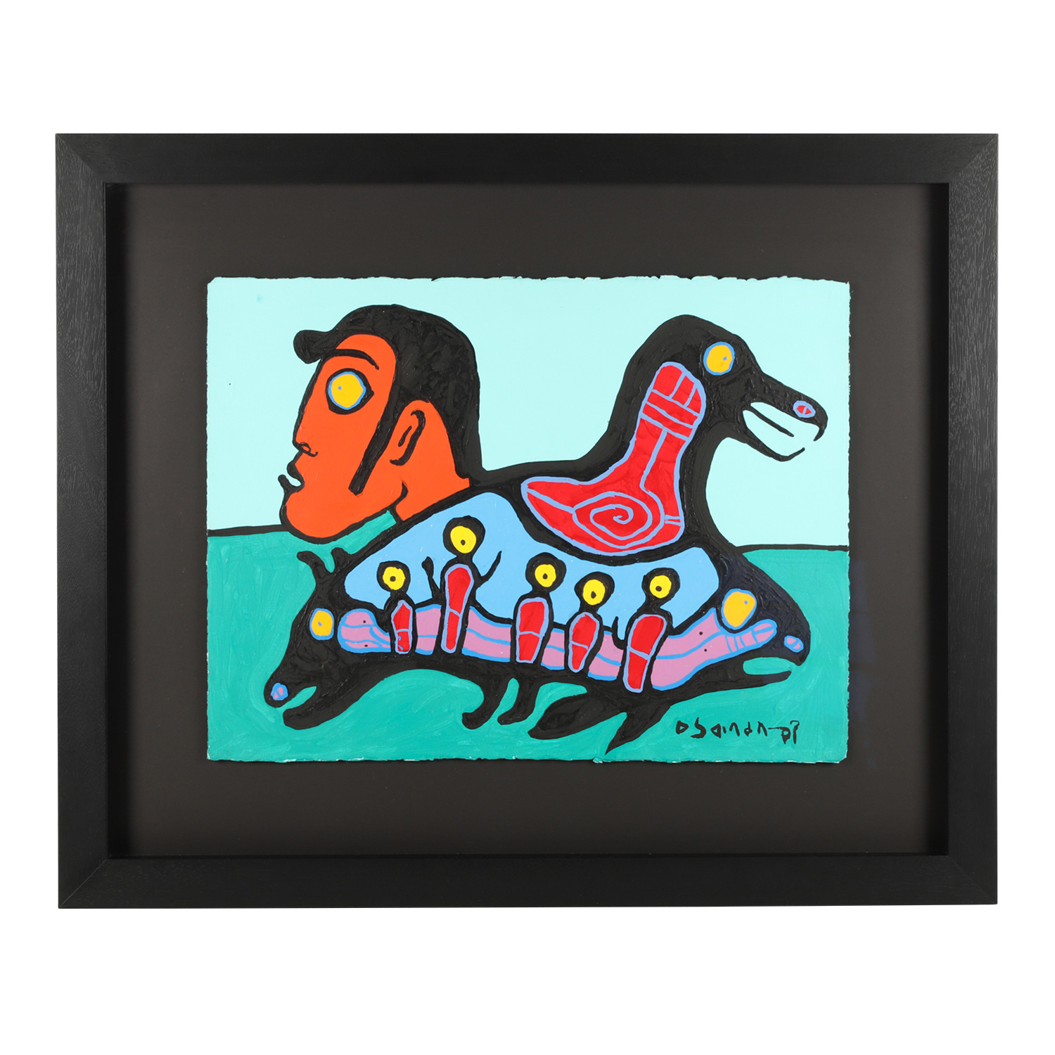 Norval Morrisseau’s Ancestral Visitors (1998) brings together many elements – such as spirits – a continuance of life in the body of one animal while showing a connection to other life and spirit forms. The work is signed lower right and measures 22 inches by 30 inches (sight, less frame), and is expected to find a new home for $12,000-$15,000.