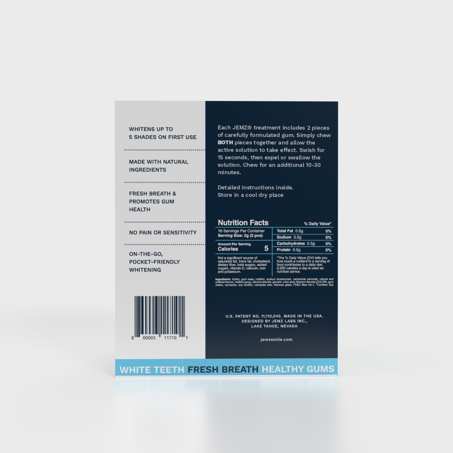 So, precisely what is Jemz® Smile? It’s a chewable treatment that includes two pieces of gum; one piece is a whitener, and one is an activator. Chew the gum, swish the saliva, and either swallow or expel it. Then, continue to chew the gum for 10 to 30 minutes. From there, Jemz® will do the heavy lifting as it freshens breath and whitens teeth up to five shades on the first use. Used anytime, anywhere, and often, this is teeth whitening maintenance personified.