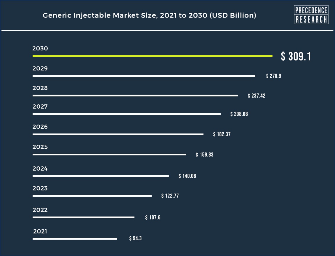 According to Precedence Research, the global generic injectable market size is predicted to hit around USD 309.1 billion by 2030 and expanding growth at a notable CAGR of 14.1% during the forecast period 2022 to 2030.