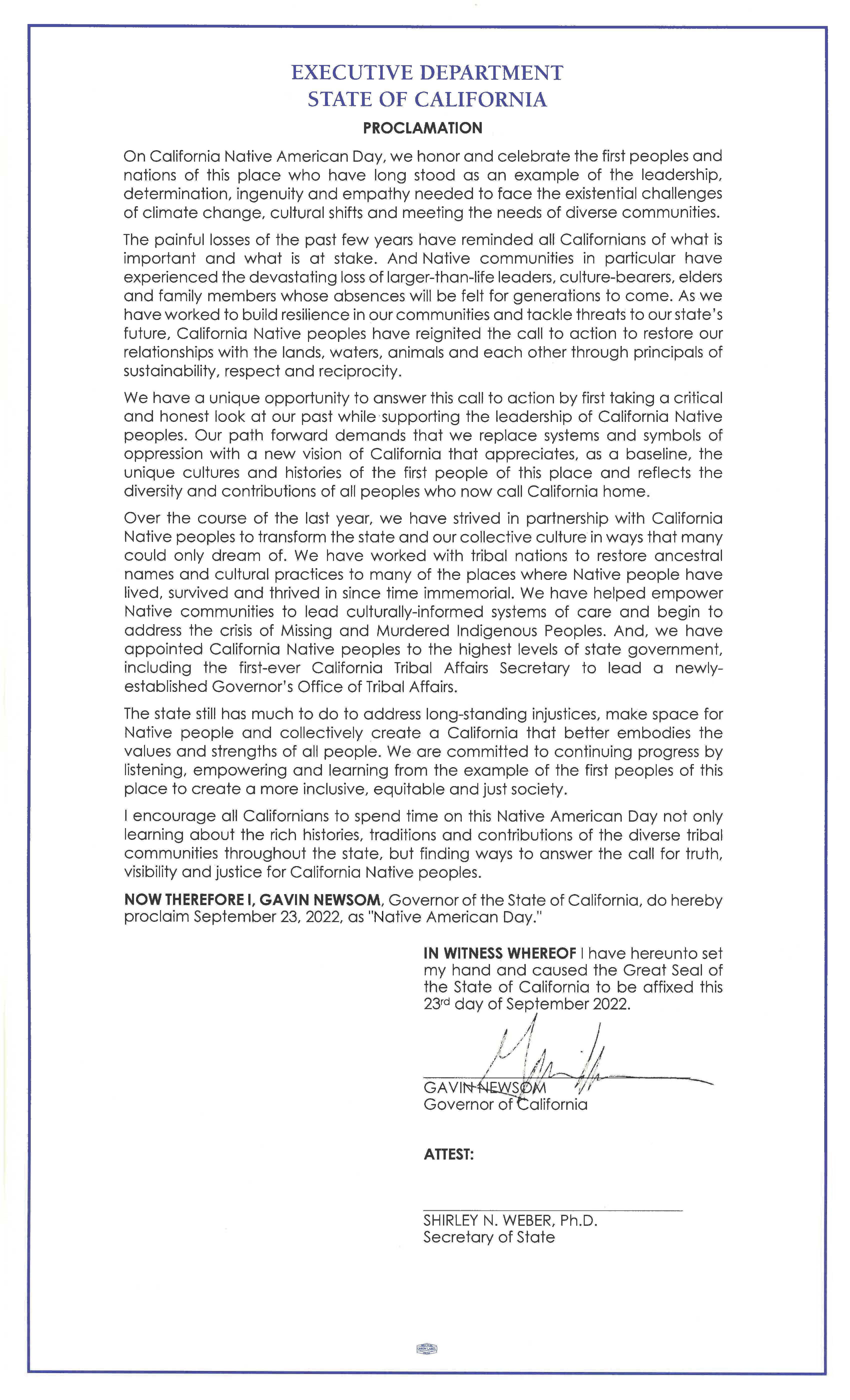 NOW THEREFORE I, GAVIN NEWSOM, Governor of the State of California, do hereby proclaim September 23, 2022, as “Native American Day.”