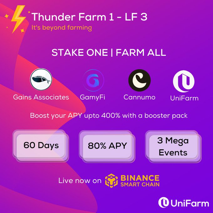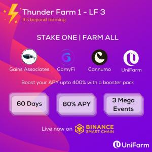 ISTANBUL, TURKEY, September 25, 2022 /EINPresswire.com/ -- UniFarm is all set to launch Thunder Farms which will go live on the Ethereum network as a Liquidity Farming Cohort featuring 4 leading blockchain projects including UniFarm($UFARM), Gains ($GAINS), Cannumo ($CANU), and GamyFi ($GFX).