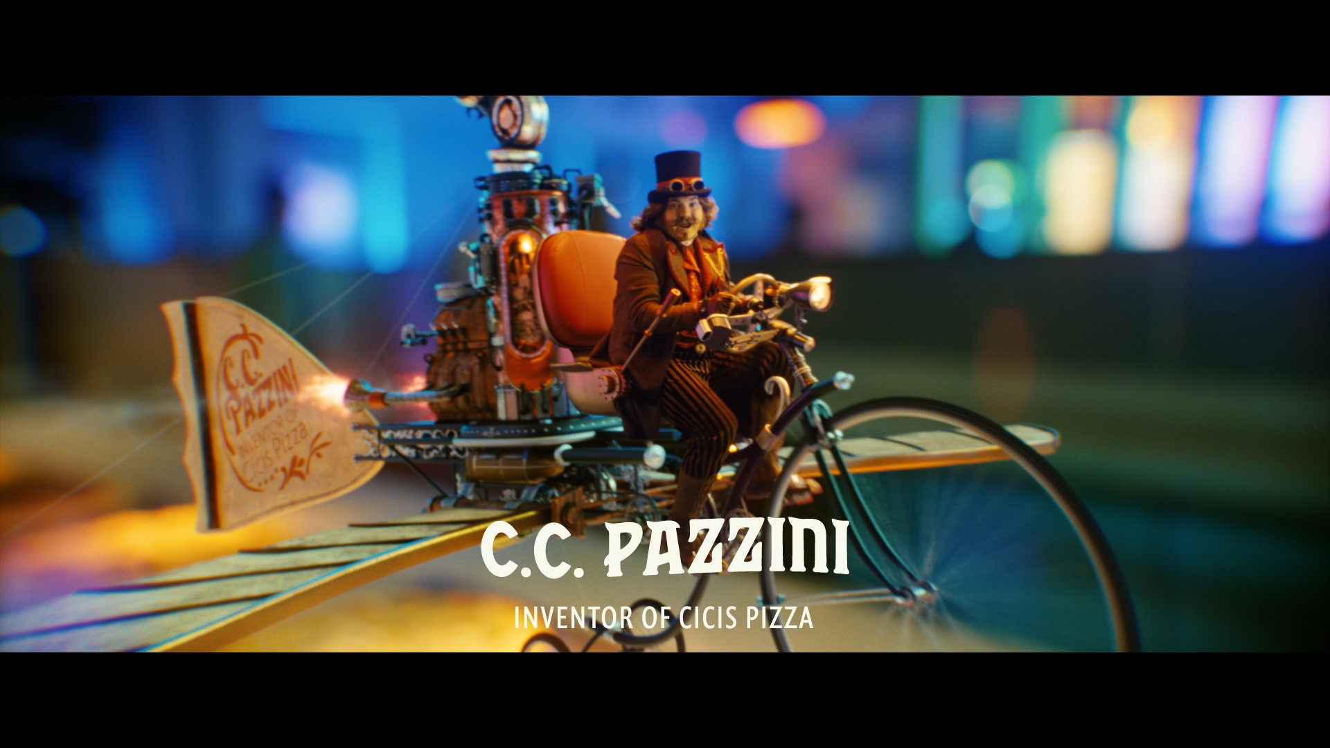 Inventor C.C. Pazzini gives viewers a tour of Cicis Pizza in his magical flying machine.