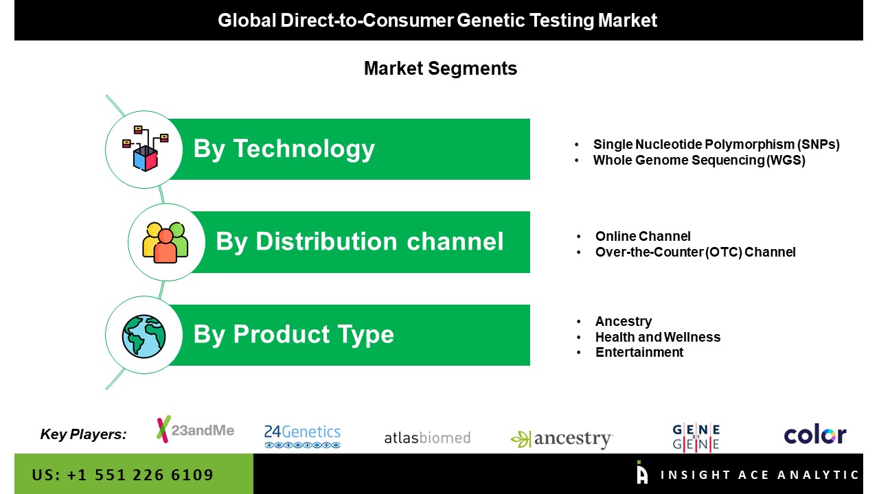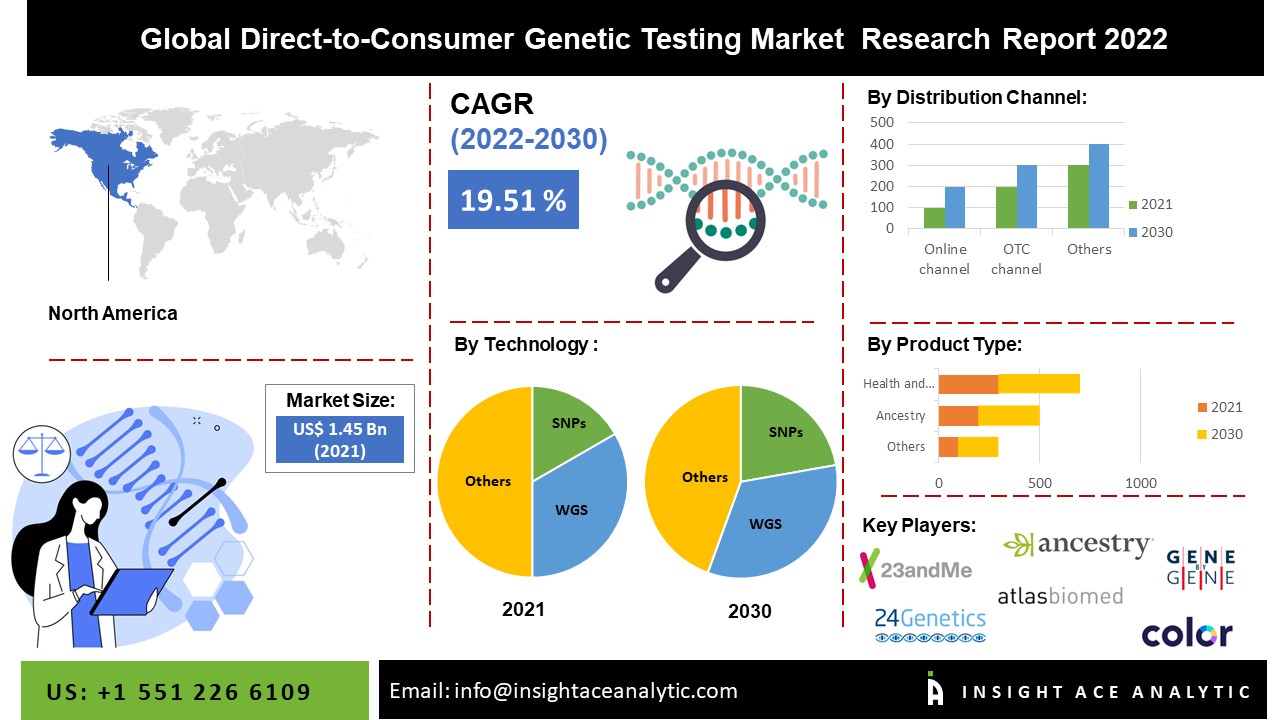 NEW JERSEY, NJ, USA, October 3, 2022 /EINPresswire.com/ -- The newly published report titled " Global Direct-to-Consumer Genetic Testing Market By (Product Type (Ancestry, Health And Wellness, And Entertainment), Technology (Targeted Analysis, Single Nucleotide Polymorphisms (Snps), And Whole Genome Sequencing (WGS)), Distribution Channels (Online Channels And Over-The-Counter Channels)) – By Trends, Industry Competition Analysis, Covid-19 Analysis, Revenue (US$ Billions) and Forecast Till 2030." of InsightAce Analytic Pvt. Ltd. features detailed industry analysis and an extensive study on the market, exploring its significant factors.